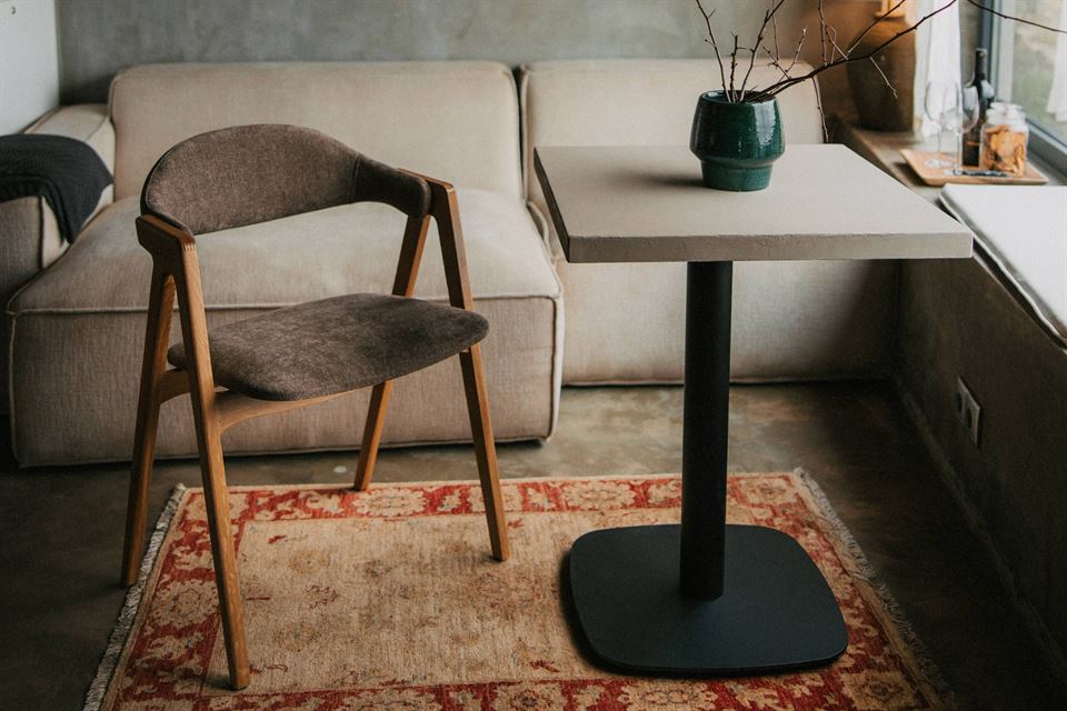 Combining cement gray with touches of mustard yellow or indigo blue adds a touch of boldness and vibrancy. For this you can add to your space the Masala armchair, a very personal armchair, where the maximalist aesthetic is complemented by the black tubular steel structure.