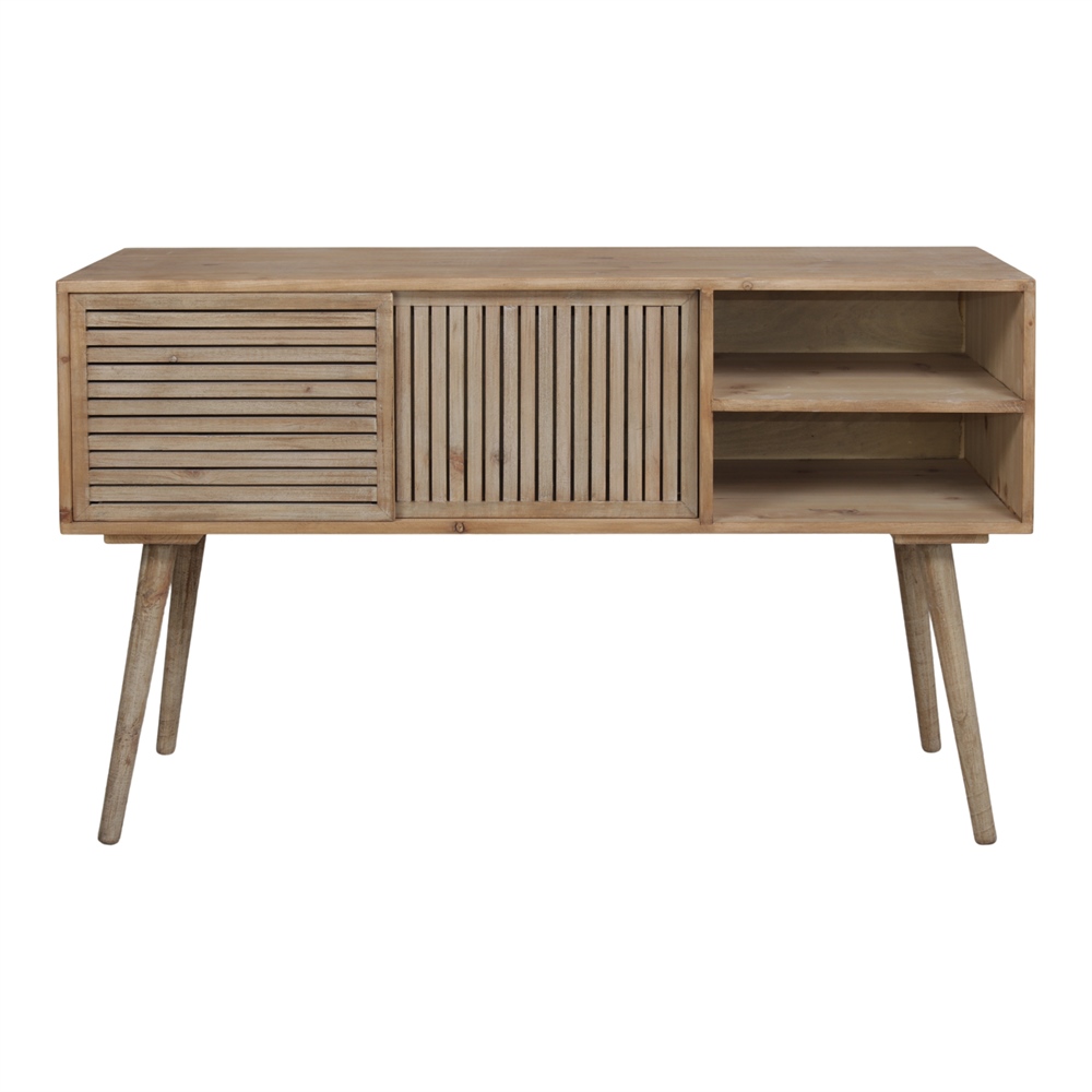An example of this timelessness can be found in the Irvin wooden sideboard, with a natural-finish, glulam fir wood frame, two very useful and discreet sliding doors and two exposed shelves. Its slender appearance is due to its sculptural needle legs, a basic feature of Mid Century furniture that always looks stylish.