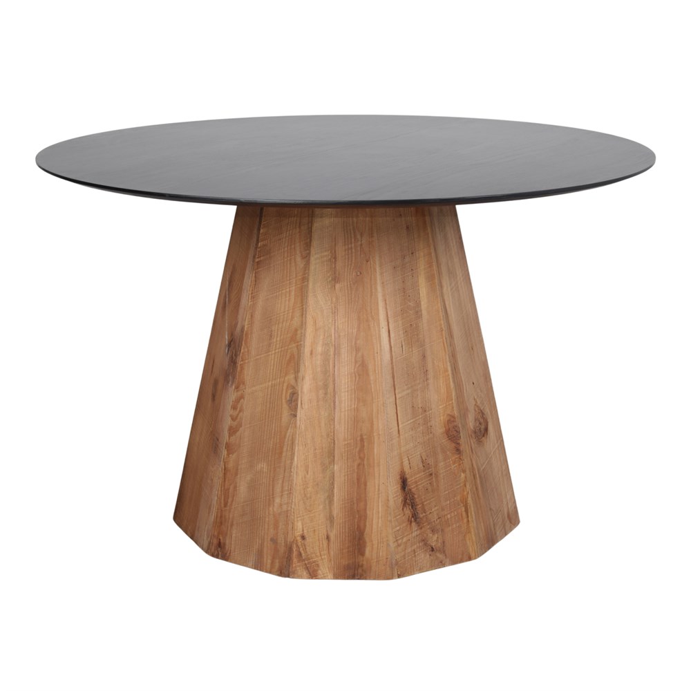 Round wooden table Nordic style. Recycled pinewood frame, and a plywood beveled tabletop with black powder paint finishing.