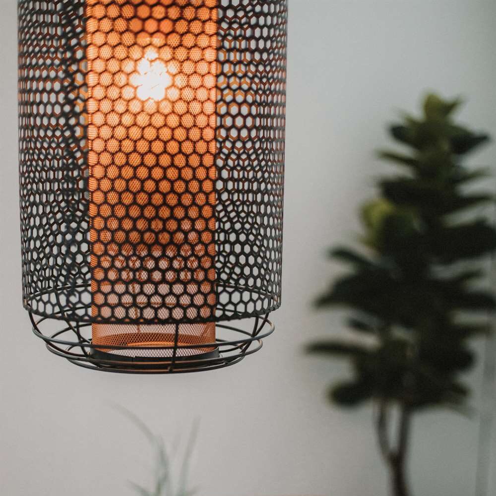Cage type lamp made of steel, with powder paint finishing.