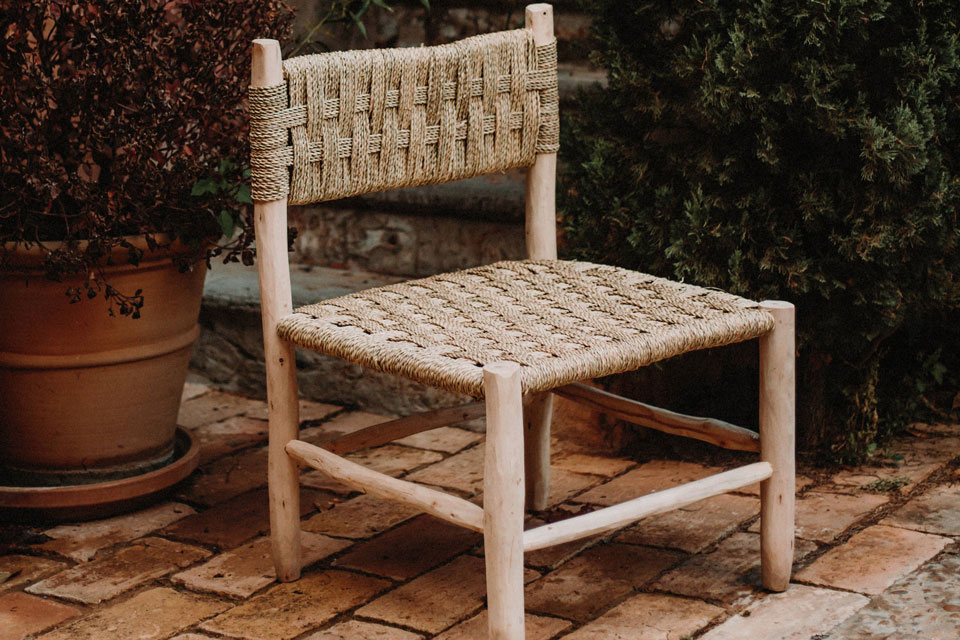 Seat and backrest made of natural rattan grid.