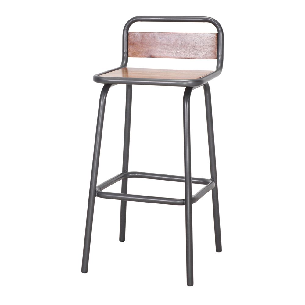 The Ankara metal and wood high stool follows the Industrial style. It has a tubular steel frame with transparent lacquered finishing, seat and backrest made of tropical wood.