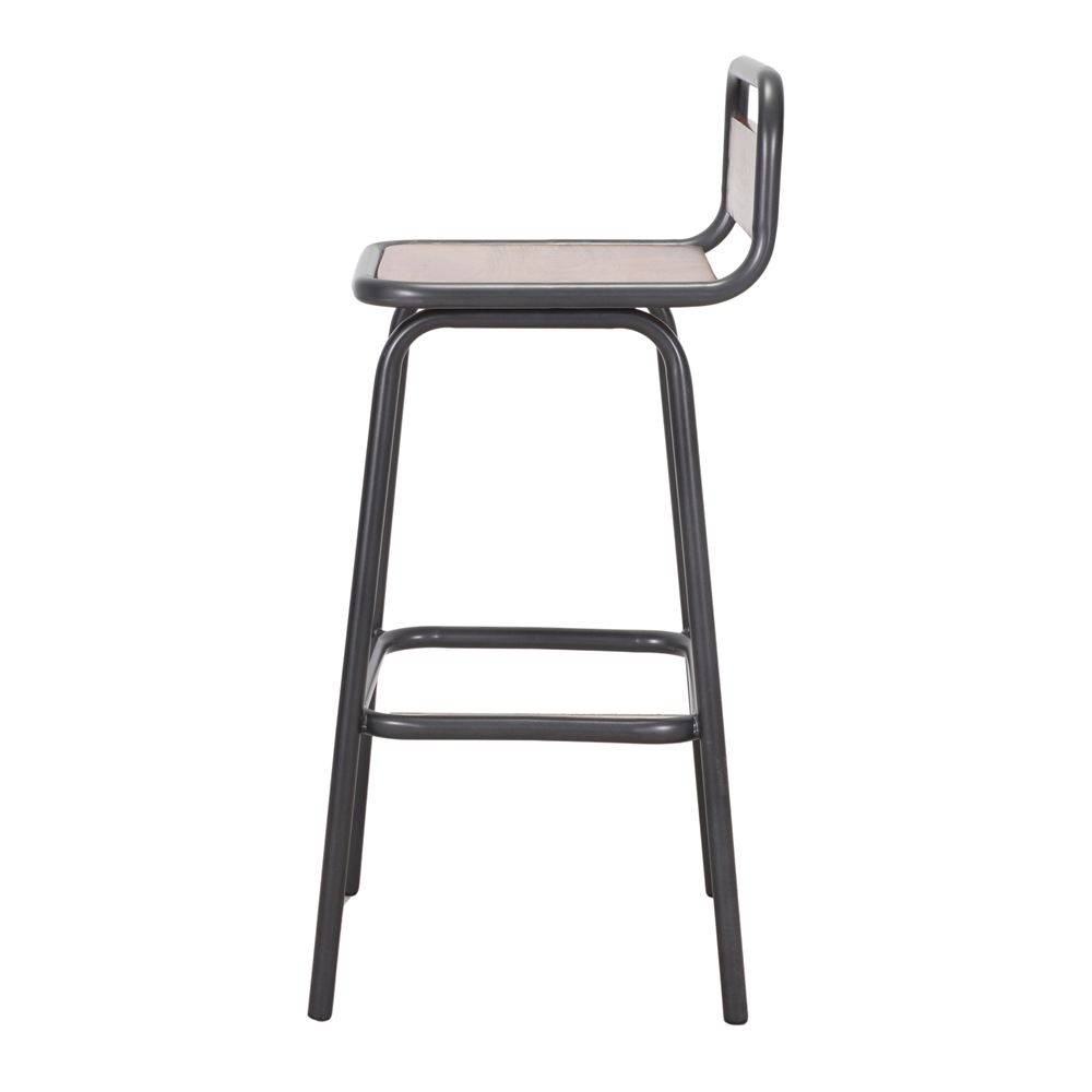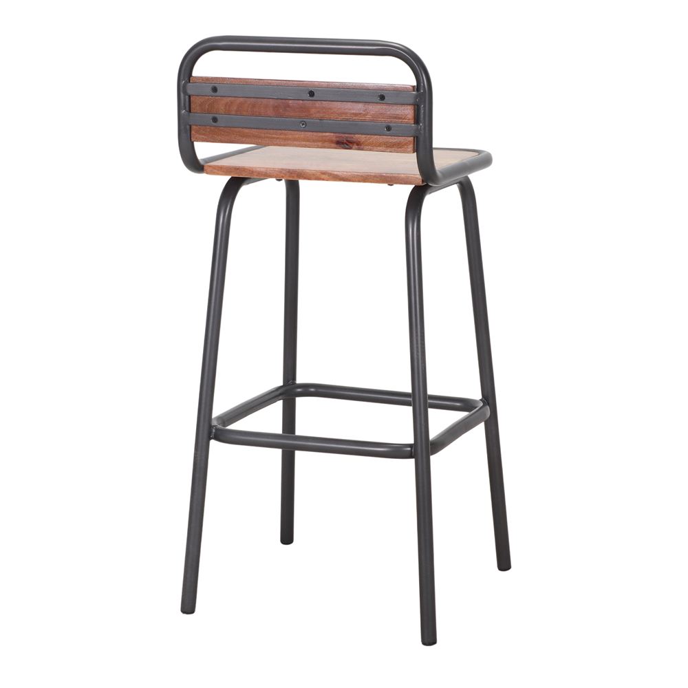 Industrial style high stool. Tubular steel frame with transparent lacquered finishing, seat and backrest made of tropical wood.