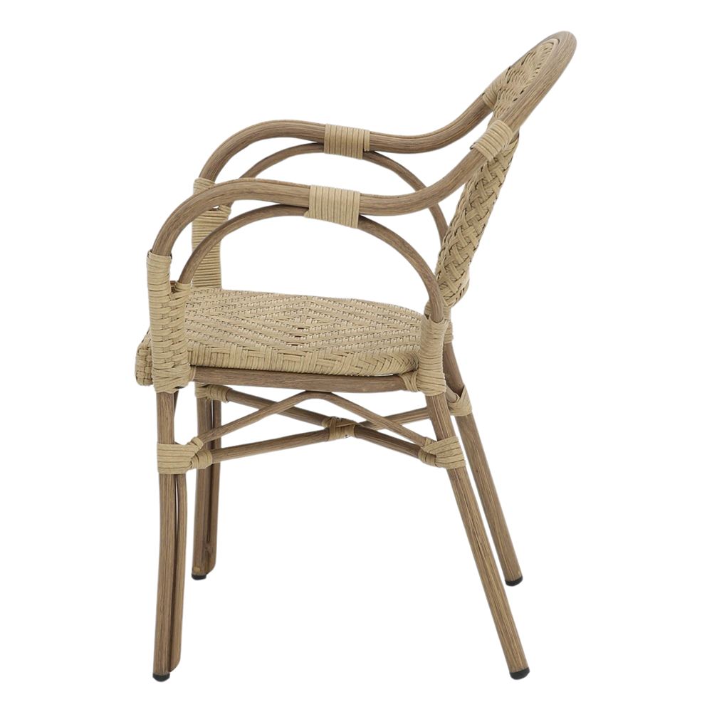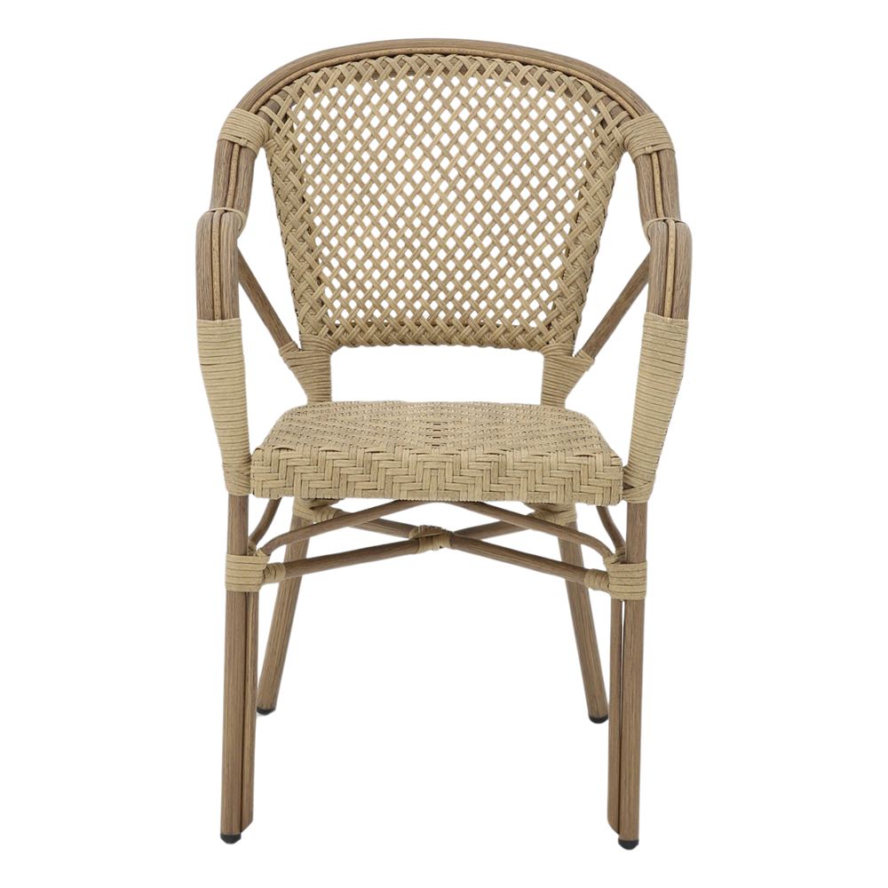The Bacio synthetic rattan chair is a bistro-style piece that brings elegance and warmth to both indoor and outdoor spaces. Inspired by the classic Parisian terraces, its design combines tradition and functionality with resistant and modern materials. The tubular aluminum structure is finished in imitation bamboo, which gives it a natural aesthetic without sacrificing the lightness and durability of metal.