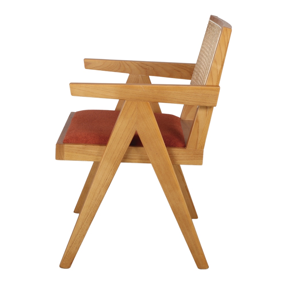 The Balford wooden chair follows the classic Rationalist style. Its frame is made of solid elm wood, its seat is upholstered in fabric and its backrest in rattan grid.