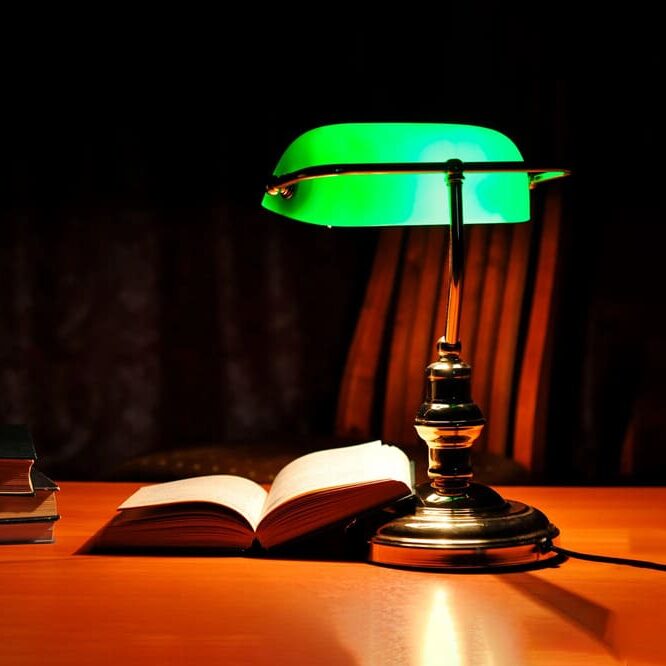 The Banker table lamp follows the Classic style, and it’s made of steel and glass.