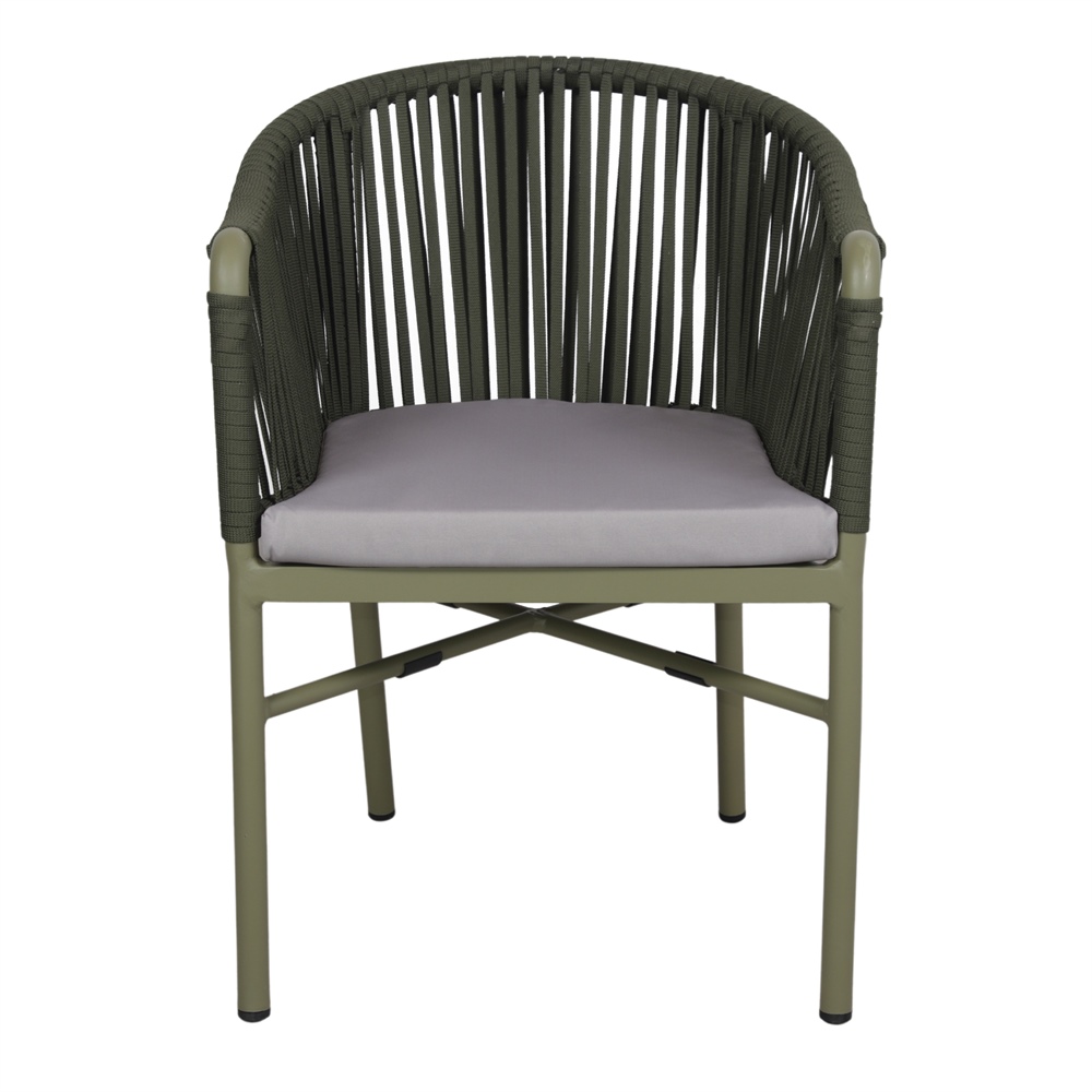 The Butler cord chair has a frame made of aluminium with a painted finish. The seat and backrest are made of polyester rope. This contemporary style rope chair is ideal for a porch, and thanks to its colourful design it will add a personal touch to your space. This chair also comes with a grey cushion for maximum comfort. Add to this, elegance, personality, lightness thanks to its materials and resistance and we have a great chair for a covered outdoor space.