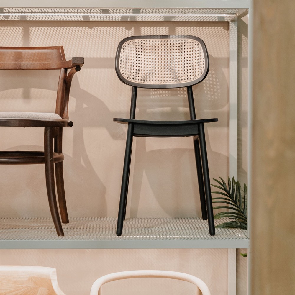 Backrest in natural cannage rattan mesh and seat in plywood.