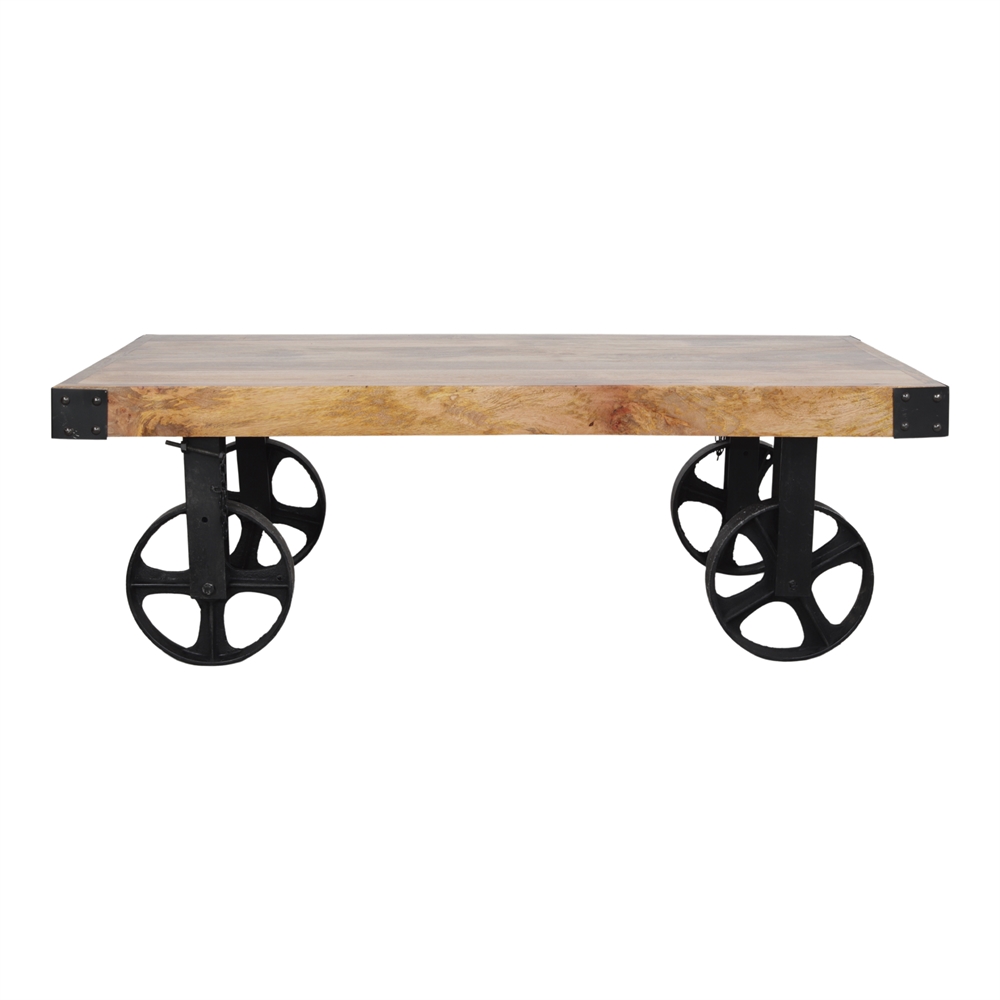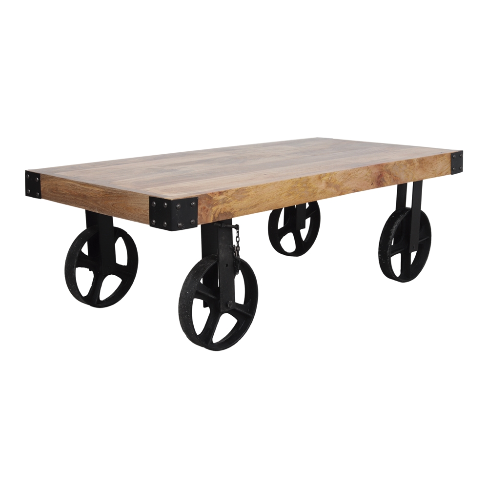 The Colins wooden coffee table follows the Industrial style. It’s made of aged wood, and has forged iron wheels.