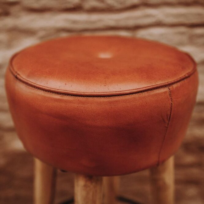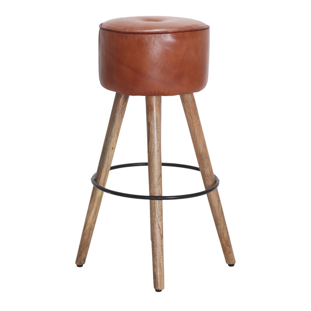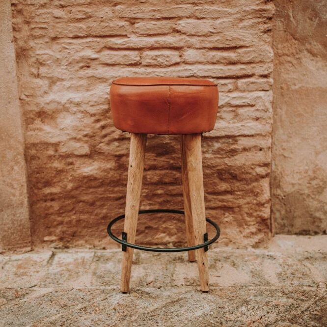 The steel rod footrest reinforces the industrial design, providing not only an aesthetic touch but also greater comfort for the user. Thanks to its combination of fine materials such as wood, steel, and leather, this stool conveys authenticity and quality in every detail.
