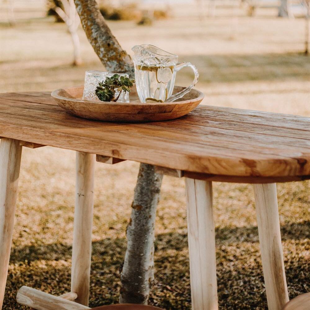 The Foscari wooden high table is a piece with a marked rustic style. Made of solid teak wood, this high table with oval top is perfect for hosting several diners.