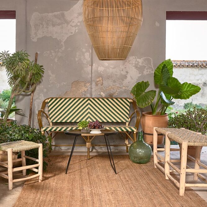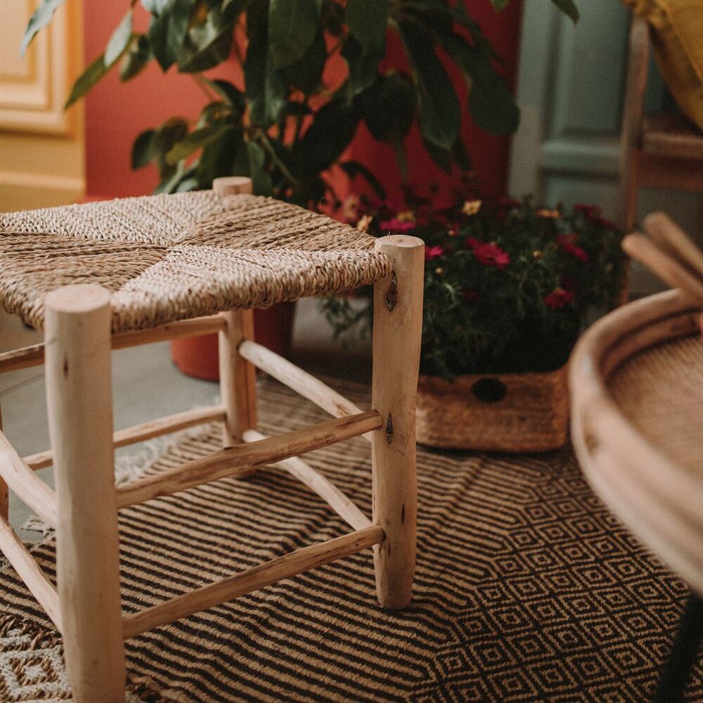 The Kandice wooden low stool is a handcrafted piece made of solid laurel wood, and a seat made of braided natural palm leaf. Put it on a dining table or in a low sofa area and get a trendy space with a natural look thanks to its totally renovated rustic design.