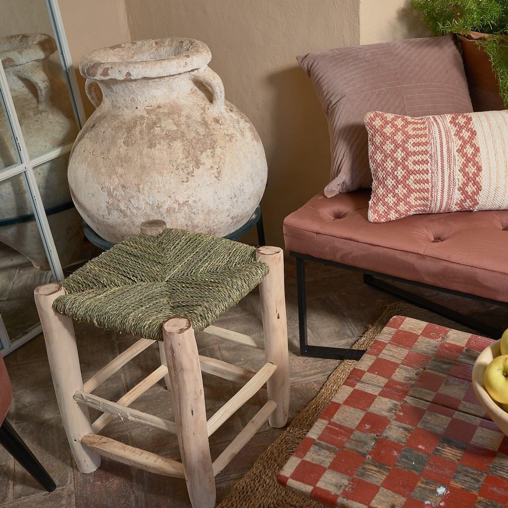 Low stool Vintage / Shabby Chic style. Frame made of laurel wood and seat made of natural palm leaf.