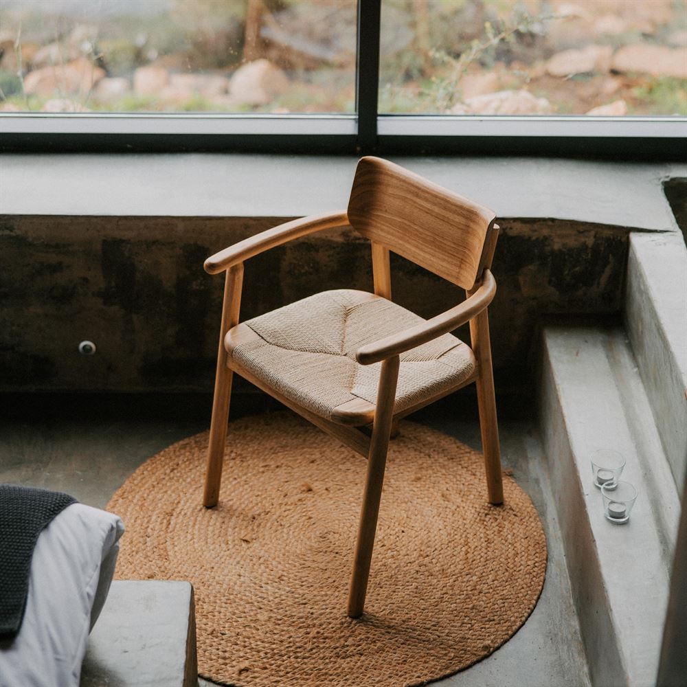 The seat, made from braided natural fiber, adds a handcrafted, organic touch that enhances its unique character. This combination of materials not only ensures comfort, but also provides an attractive contrast between the warm texture of the wood and the braided design of the seat.