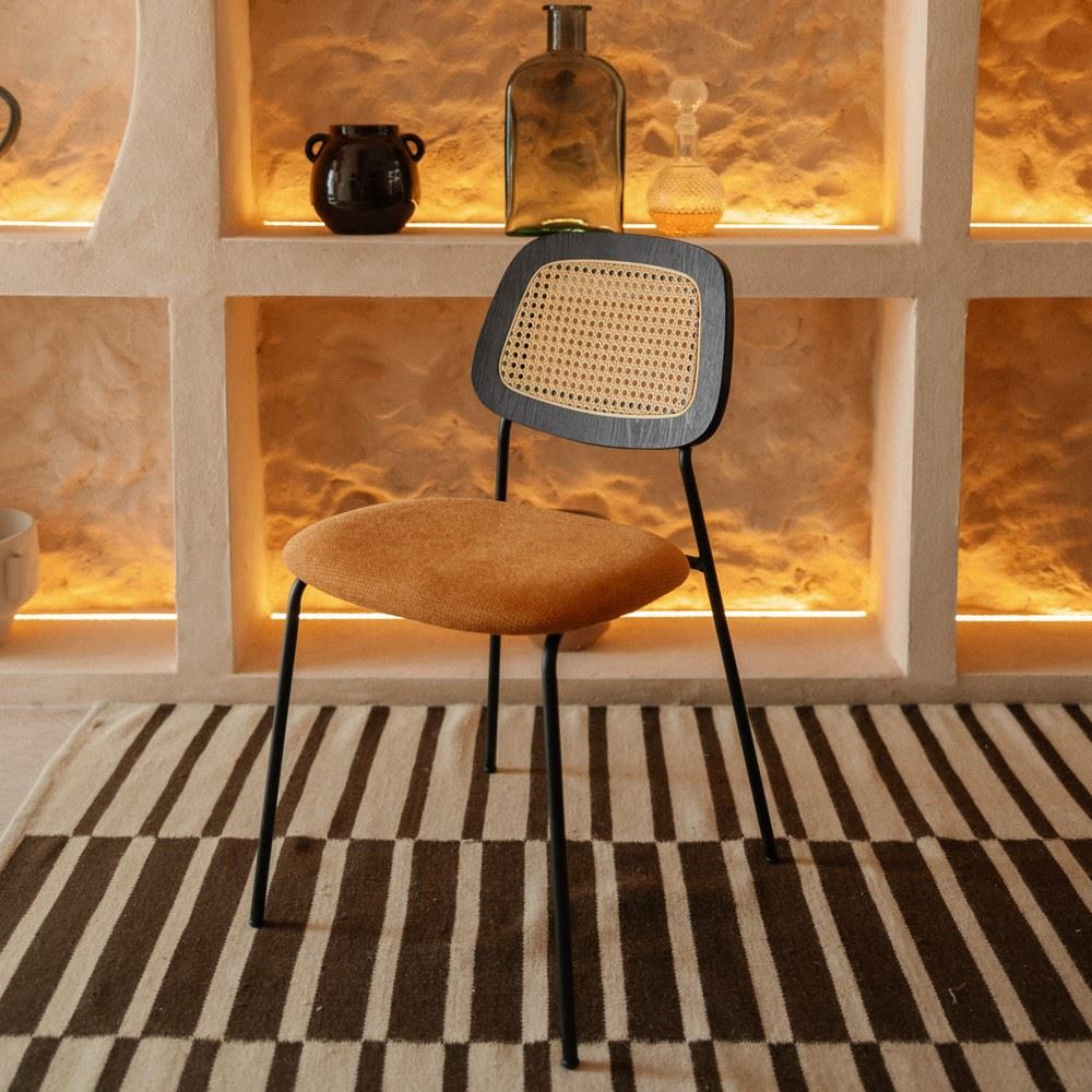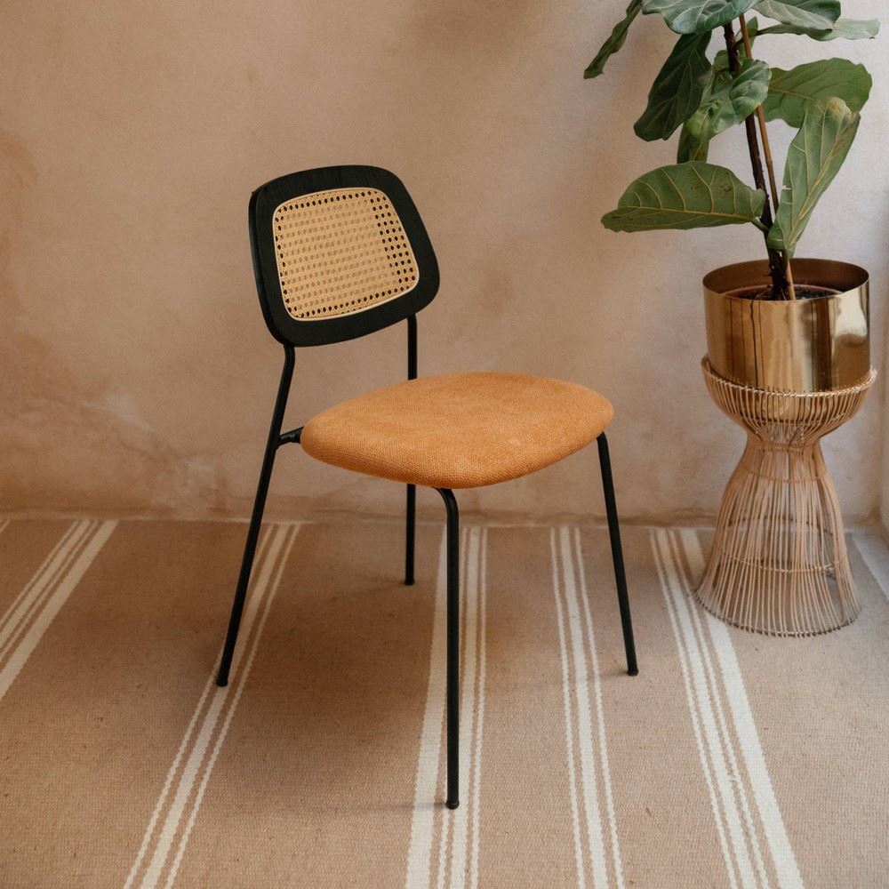 Originality and comfort are at the heart of the Melita upholstered chair ‘s design. Its fabric upholstery will provide a soft touch and a comfortable seat as well as a warm and welcoming look to your indoor space. Its backrest in wood and grid will provide an organic touch. Cushioned in foam, this upholstered chair is ultra comfy, which makes it a perfect dining room chair. To make this upholstered chair shine we can combine it with a big dining table.
