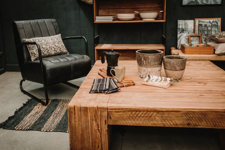 Now, we are going to focus on the Hudson coffee table, a table of square proportions perfect for the sofa area, with a nice rug on the floor and a puff that accompanies it, you have a space of comfort with a rustic furniture category.