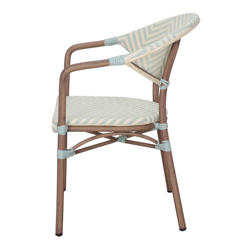 Its lightweight yet sturdy tubular aluminum frame is finished in a delicate olive wood imitation tone, which adds warmth and a natural look without sacrificing the strength of the metal. The seat and backrest are made of textilene, a high-quality, comfortable, breathable, and easy-to-maintain material that guarantees durability against continuous use.