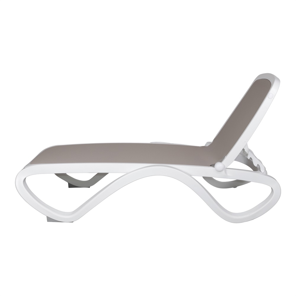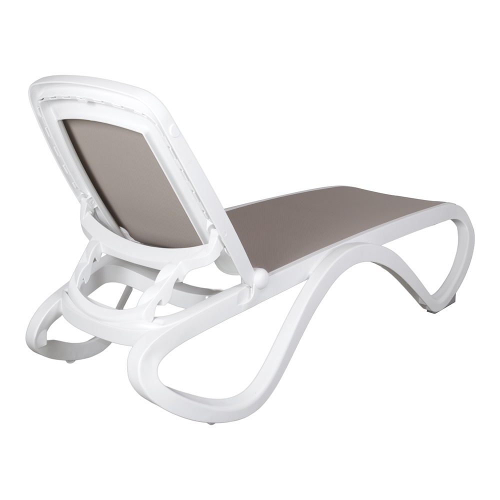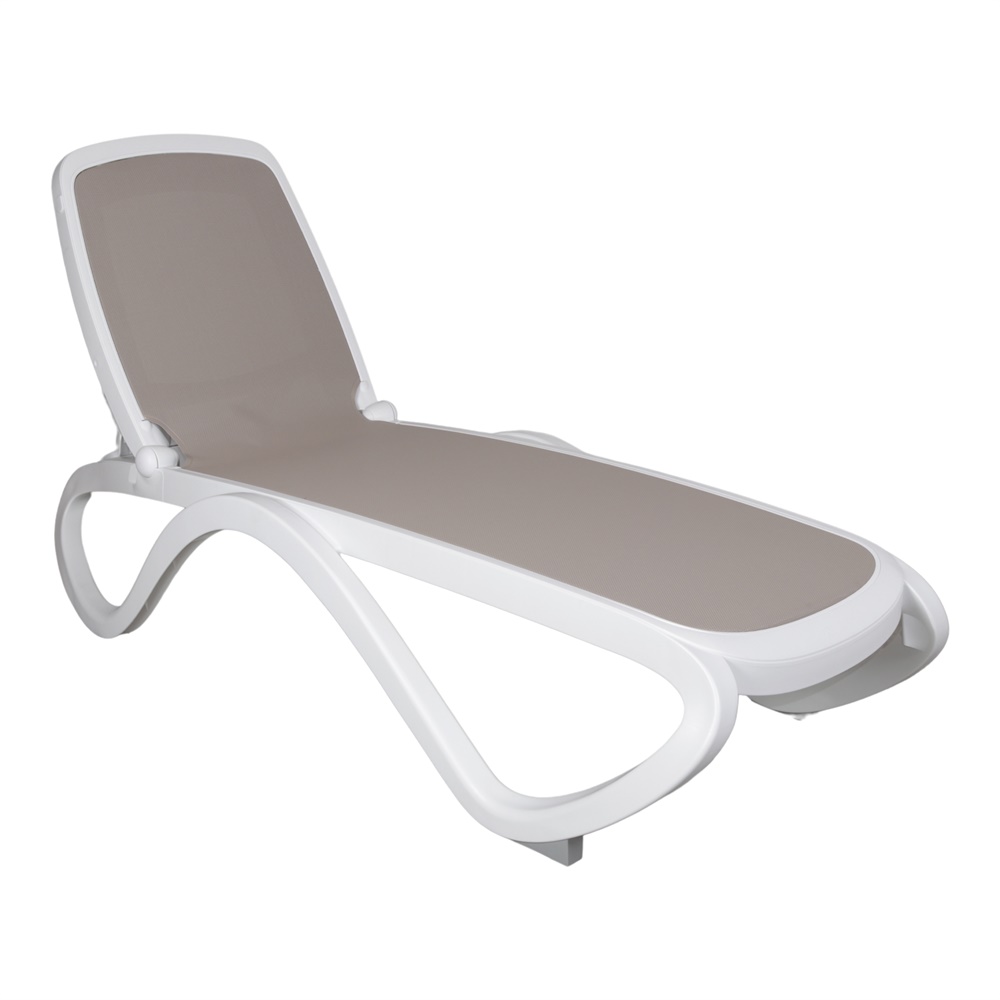 Olarga outdoor lounger with tubular resin structure and breathable synthetic fabric interior. Backrest adjustable in four positions and available in different color combinations between structure and fabric. Stackable.