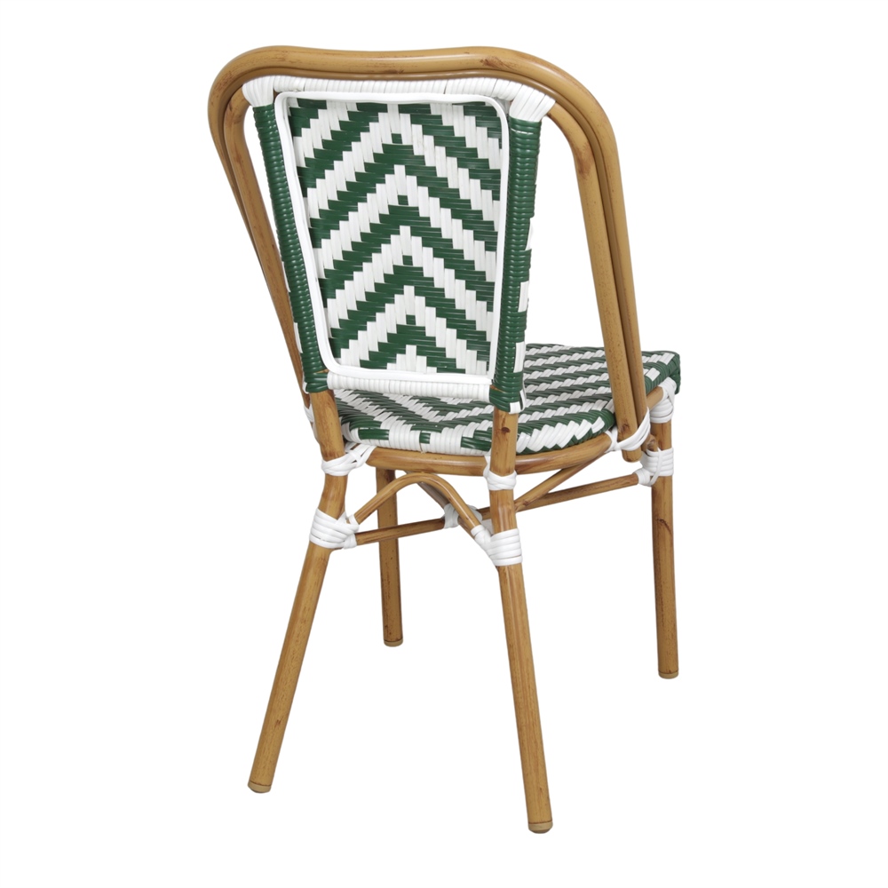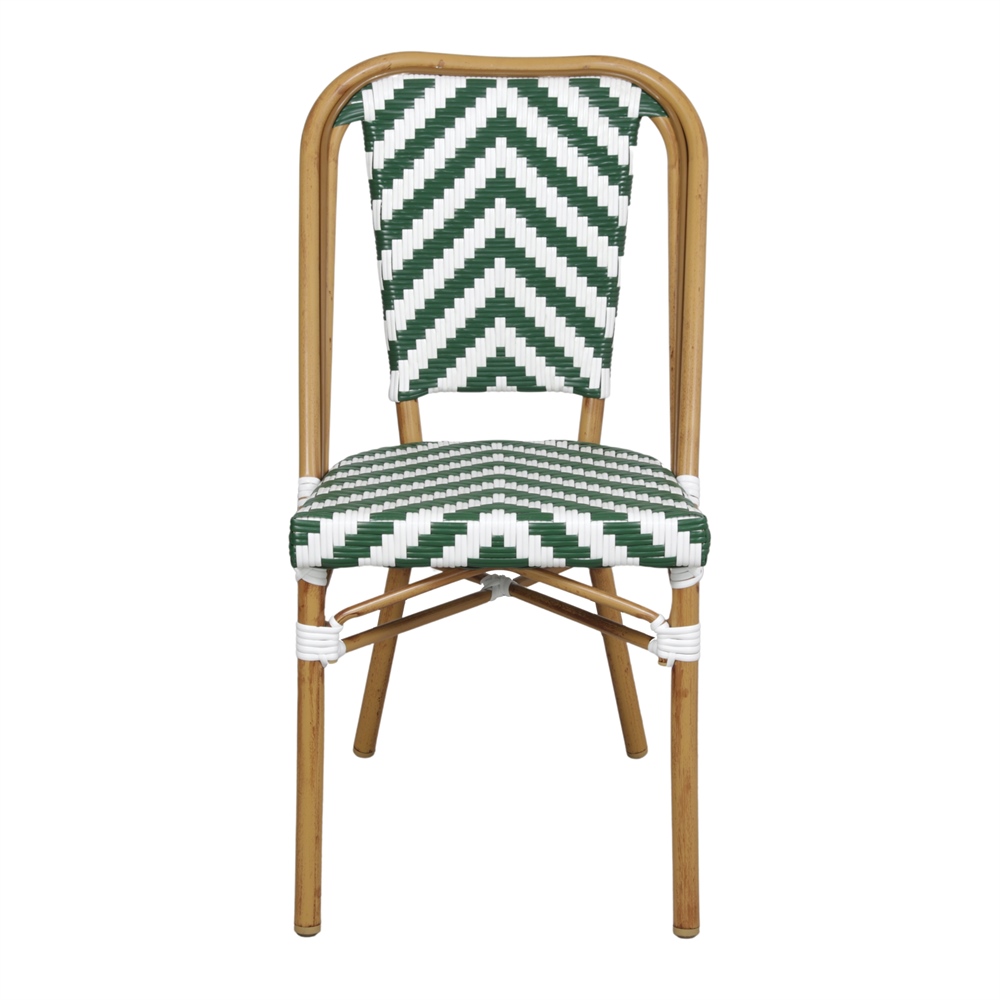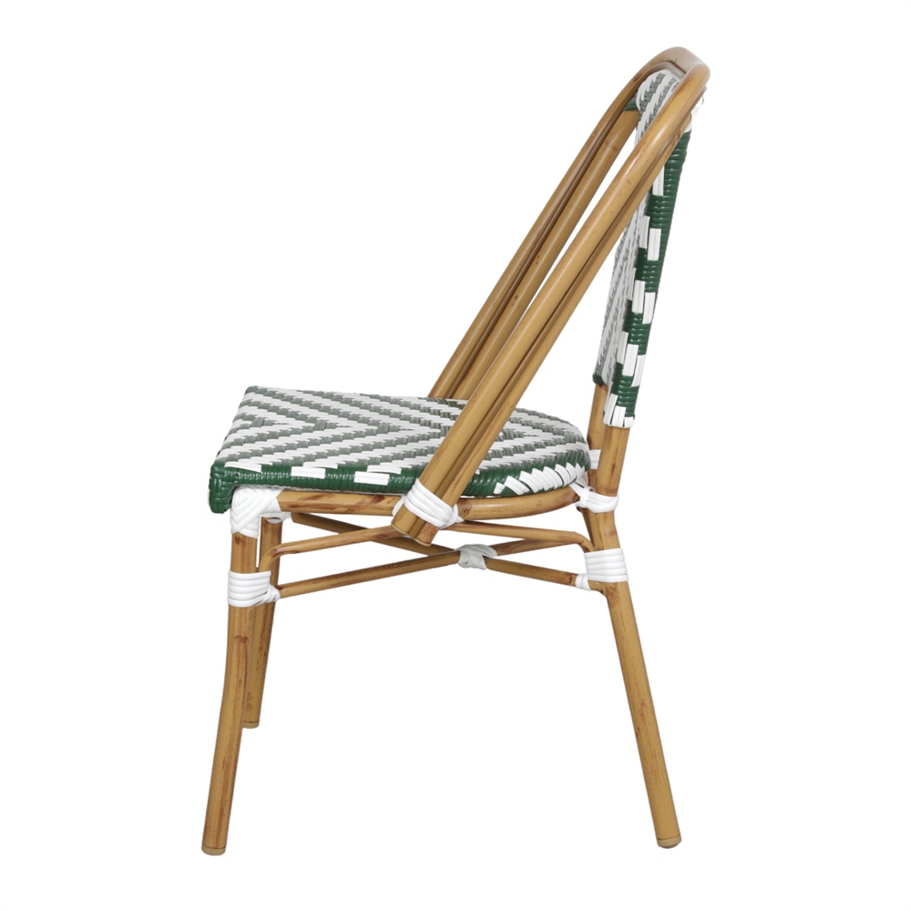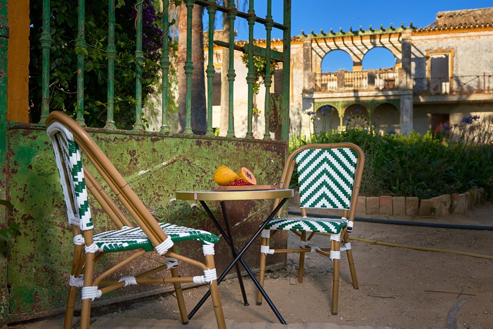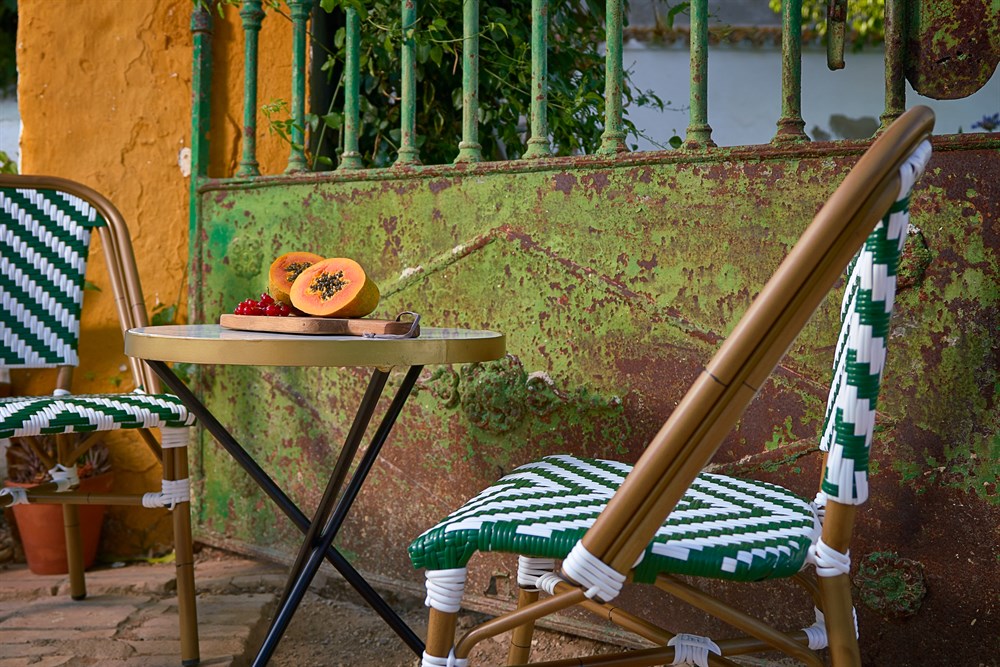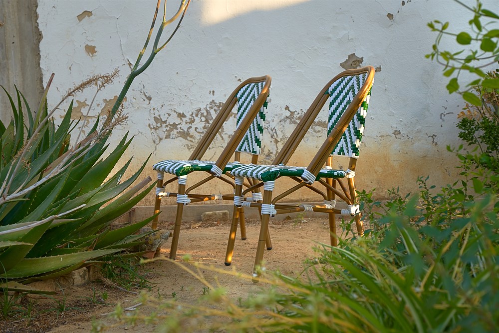 Sit on one of the biggest trends of this season with our Pacific outdoor chair, made of aluminium with imitation rattan finishing. Synthetic rattan is now arriving to our indoor spaces and that’s not a surprise: this solid fabric gives texture to the chair’s look, and it’s been used on several iconic designs of the history of decoration. In this outdoor chair, synthetic rattan provides a more contemporary look than traditional rattan, and that makes this chair so easy to maintain. This chair is perfect for a patio, a terrace or a garden. You can combine it with other Bistró estyle furniture to get the perfect combination. Its unique design is the perfect recipe to an original piece of furniture that will give your space a parisienne look.