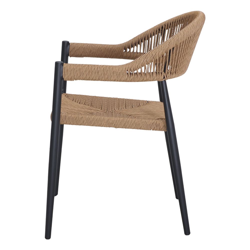 The black paint finish not only adds sobriety and modernity, but also provides a durable protective coating against outdoor conditions. The seat and backrest are made of braided polyester rope, a material resistant to UV rays and humidity, which also offers a pleasant feeling of comfort and visual appeal thanks to its handcrafted braiding.
