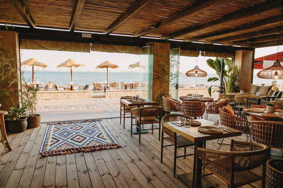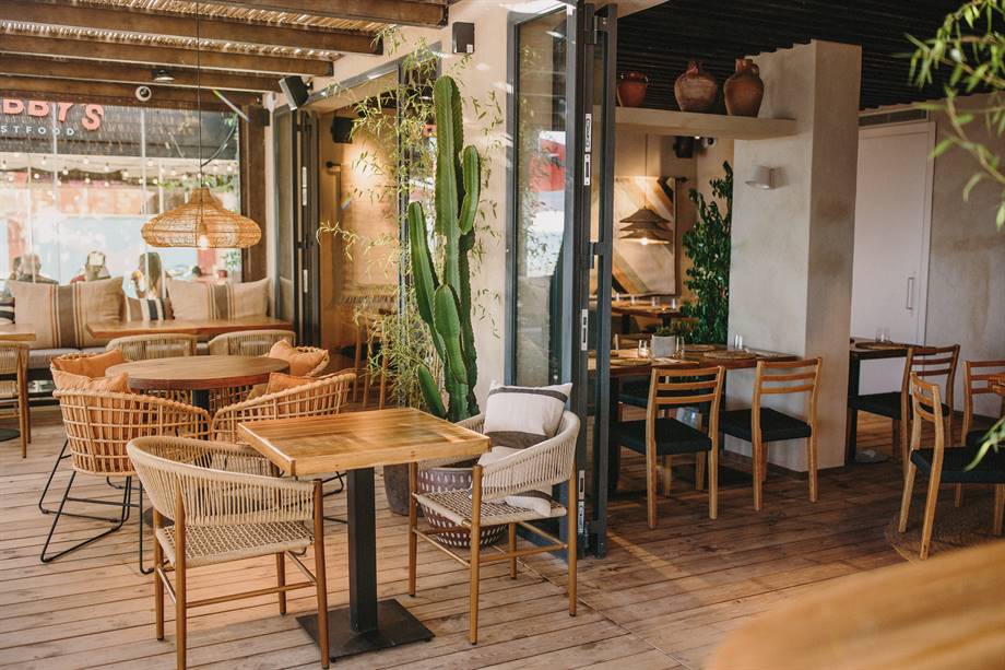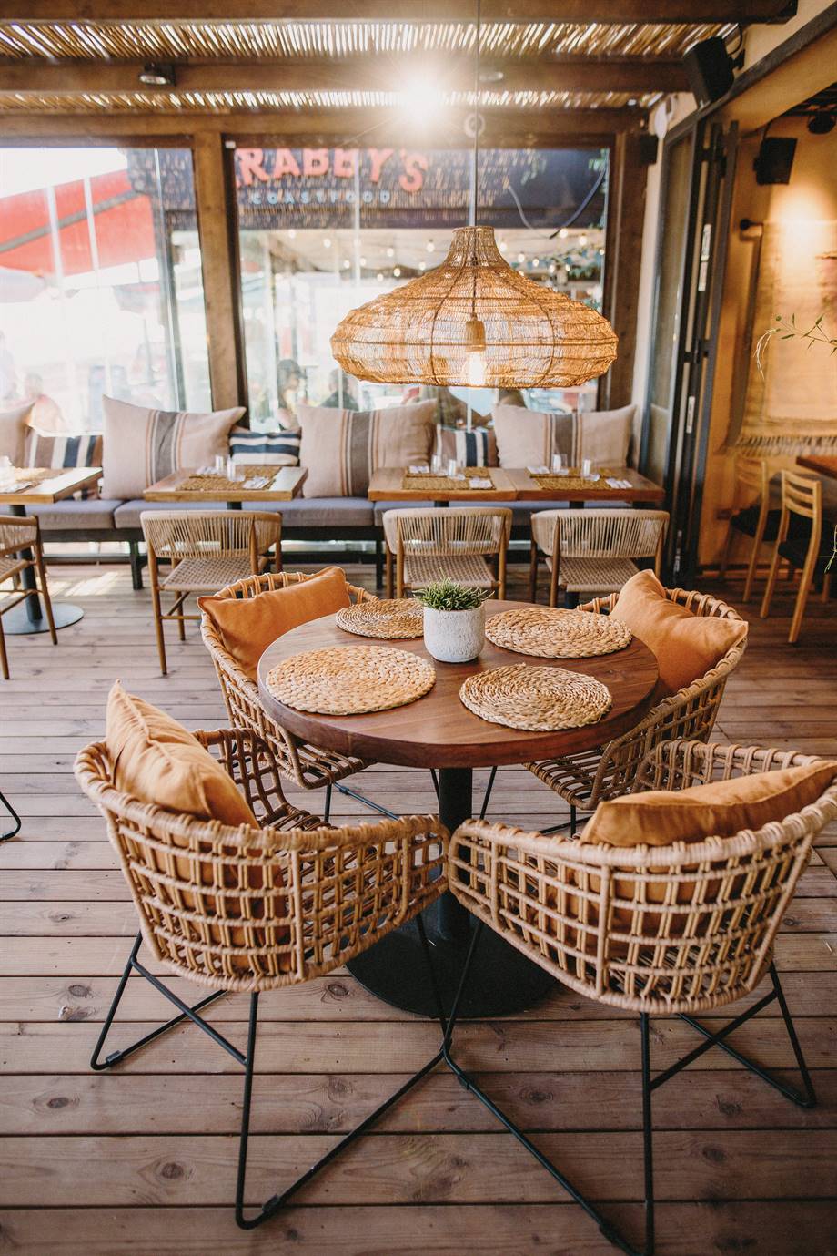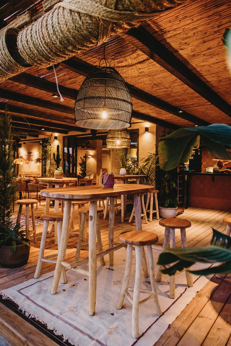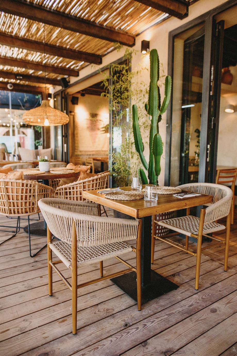 The glazed area, is at street level and has high tables, teak wood, very handmade and rough-looking, which bring a very rural touch to the overall aesthetics. Also the rope or rattan chairs, a custom-made bench upholstered in gray and with beautiful cushions, which accompany the general chromatic range of earth tones, gain prominence.