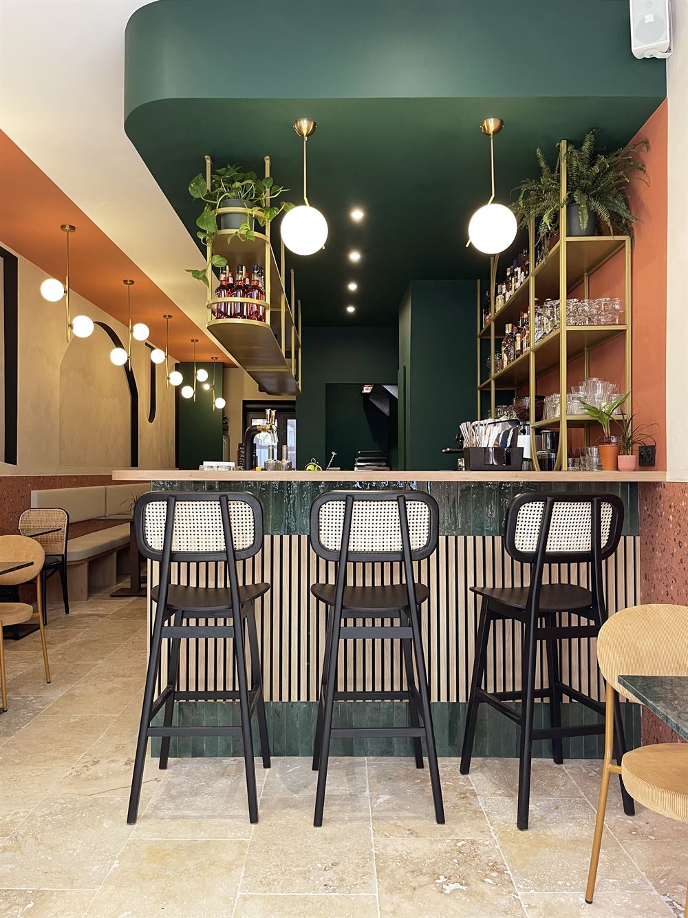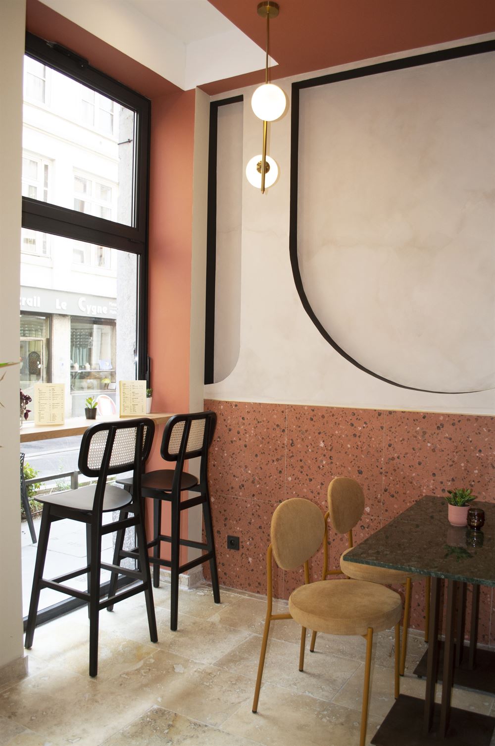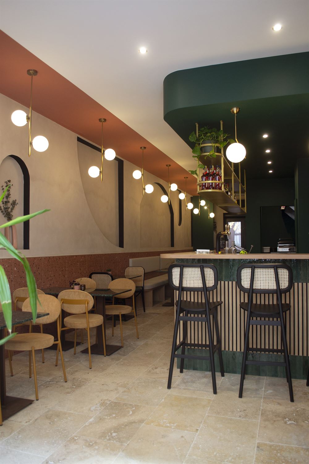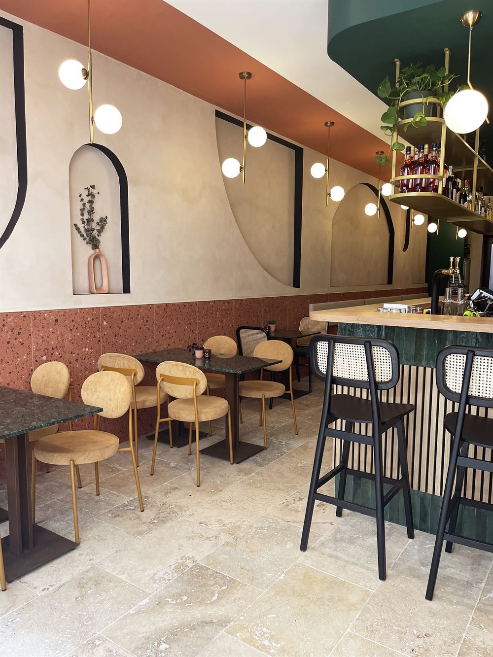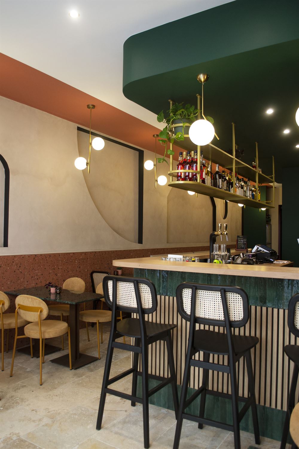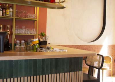 Once they had chosen the layout of the place, they selected refined materials such as brass, marble, textile, porcelain stoneware, terrazzo, etc… and paints in keeping with the visual identity of the premises. Continuing with the choice of furniture and decoration in a chic and retro style.