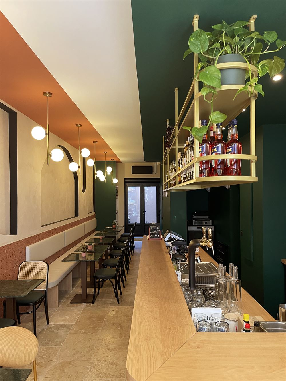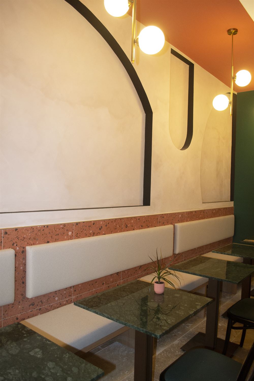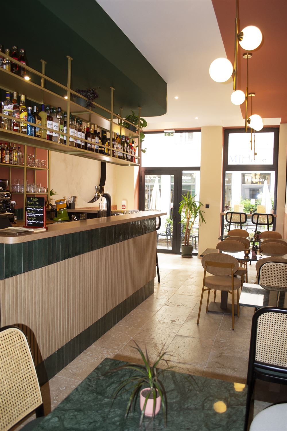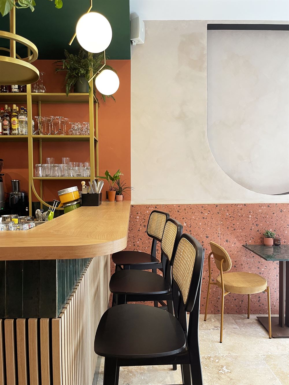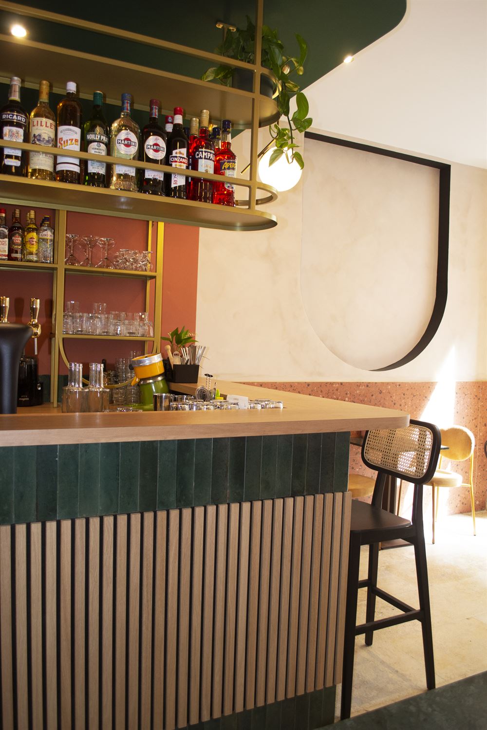Once they had chosen the layout of the place, they selected refined materials such as brass, marble, textile, porcelain stoneware, terrazzo, etc… and paints in keeping with the visual identity of the premises. Continuing with the choice of furniture and decoration in a chic and retro style.