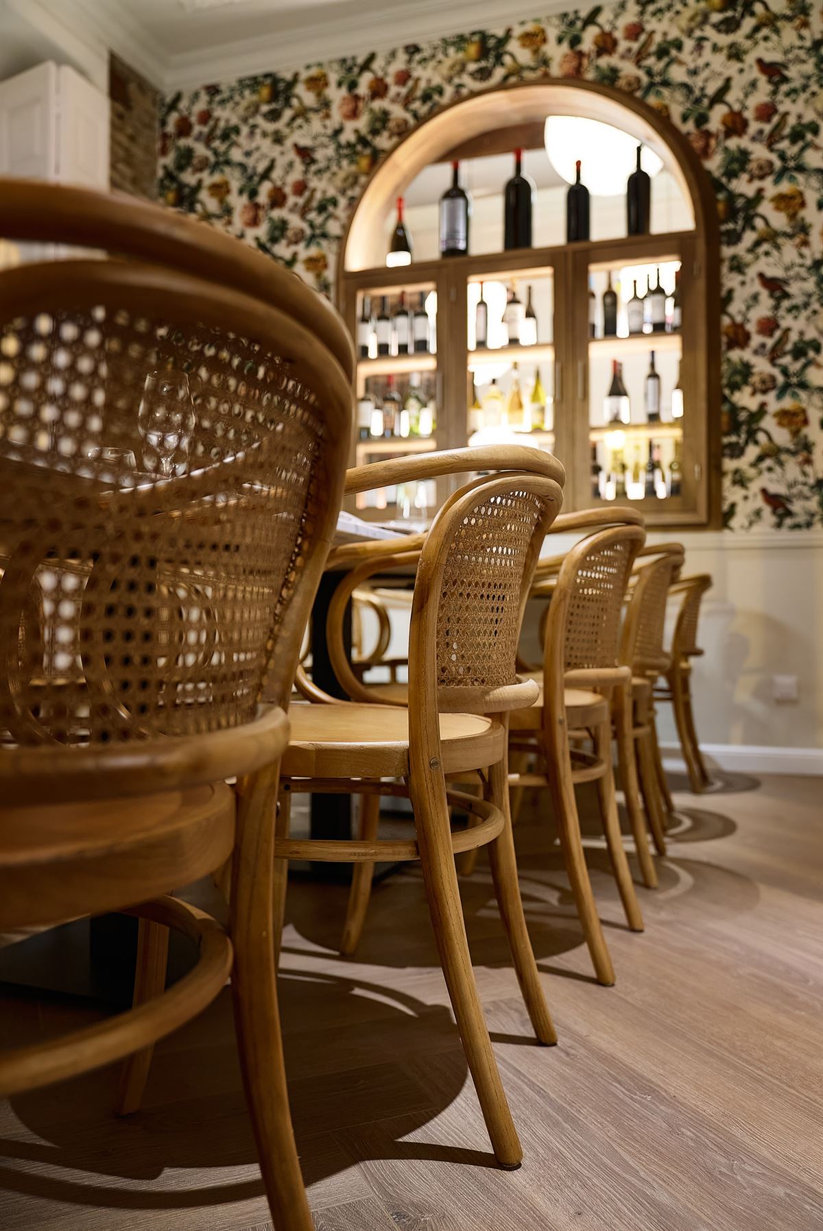 The design of this decorative project, which as we said has extraordinary details, has been made by MisterWils interior design team, who have created an atmosphere of theatricality with a lot of originality, with mostly wooden furniture and textiles, creating very cozy and bright spaces. The walls cannot go unnoticed, and even less the mirror that is the highlight of the whole scene. Dividing the space by small rooms and decorating the passage from one to another with wooden lattices and cannage, an admirable esthetic. We can not overlook the showcases where the wine is located, some serve as a separation and others are perfect decorations for this particular project.