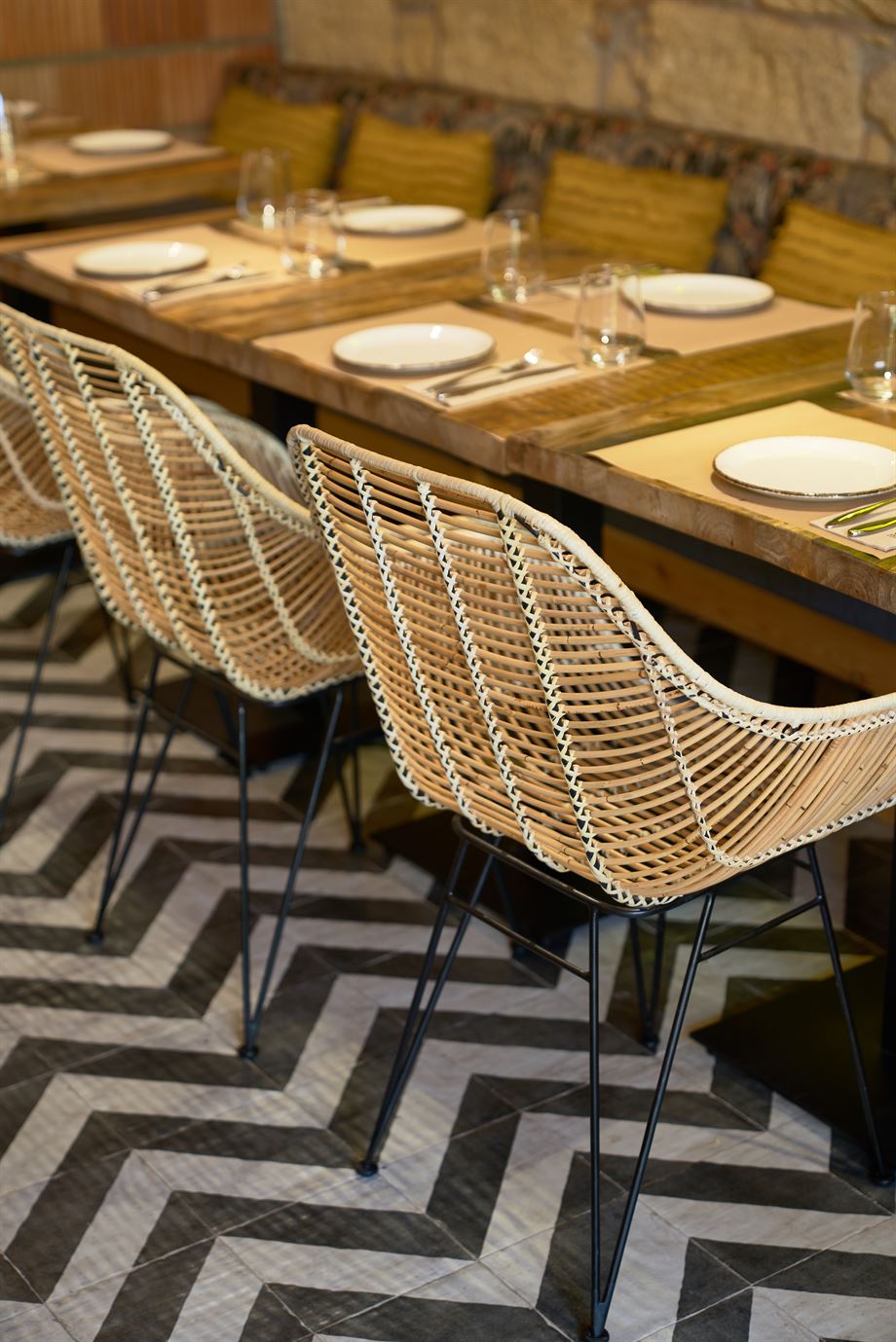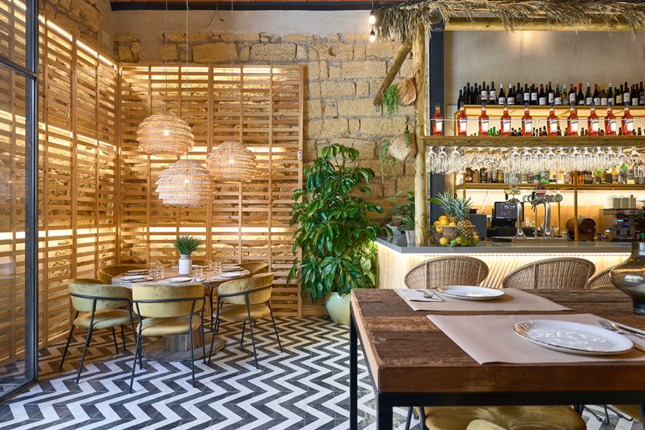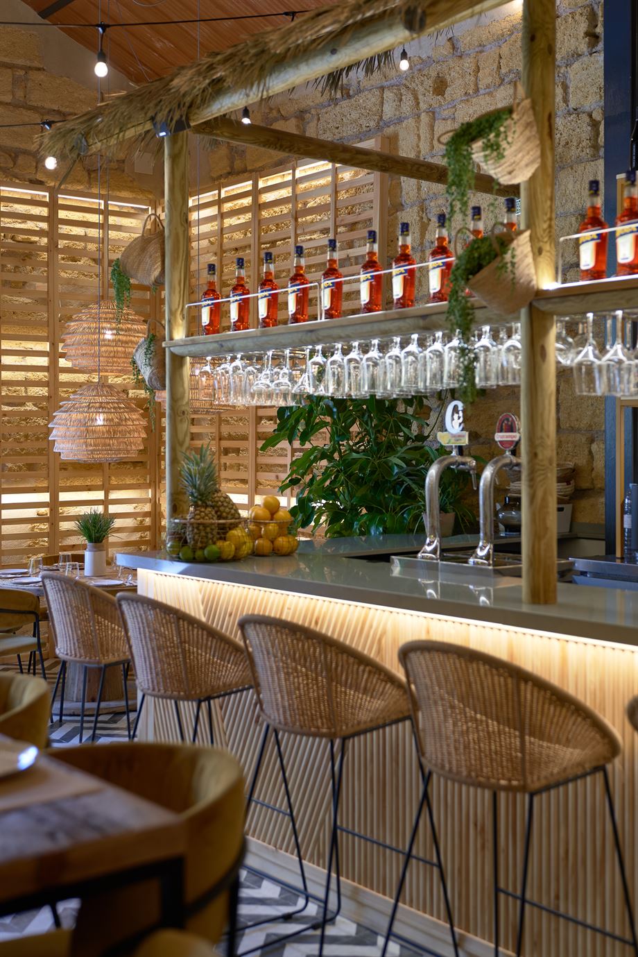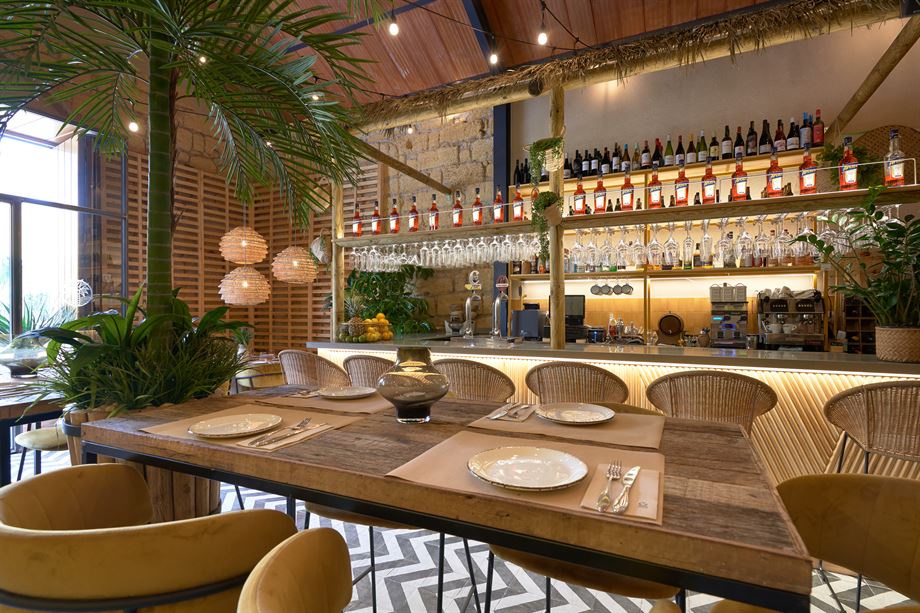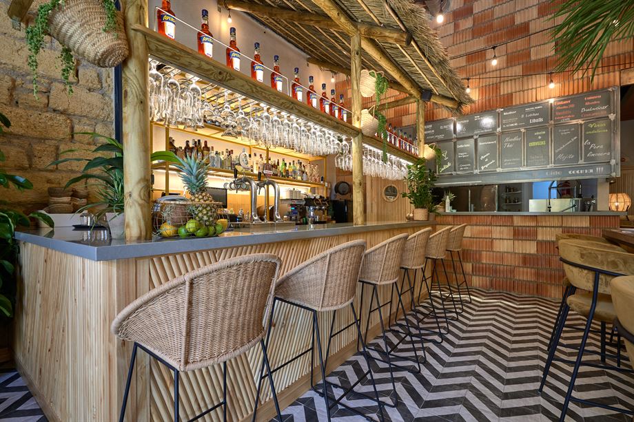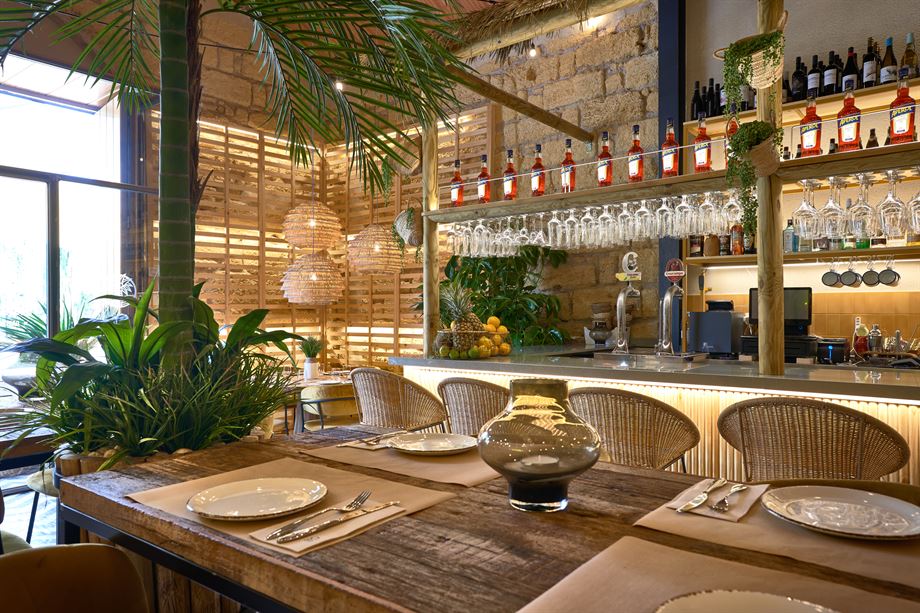 Organic materials have been used in the construction (such as cane for the bar and untreated wood for walls and finishes) and with a rustic touch, leaving the walls with exposed brick.