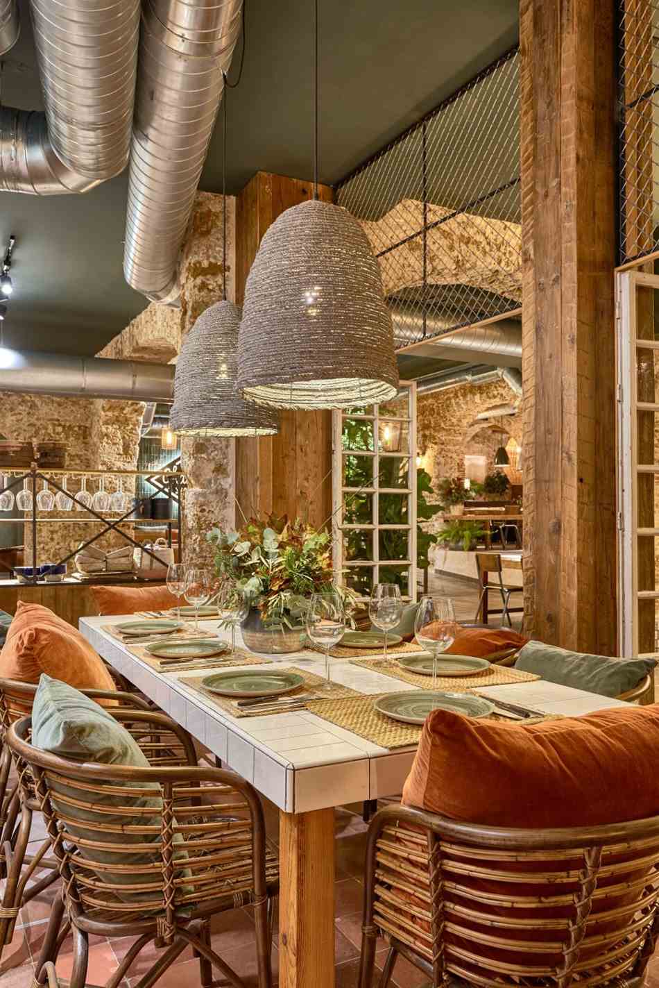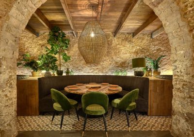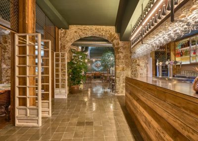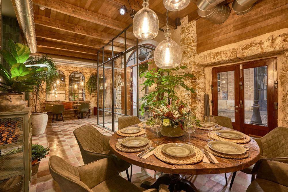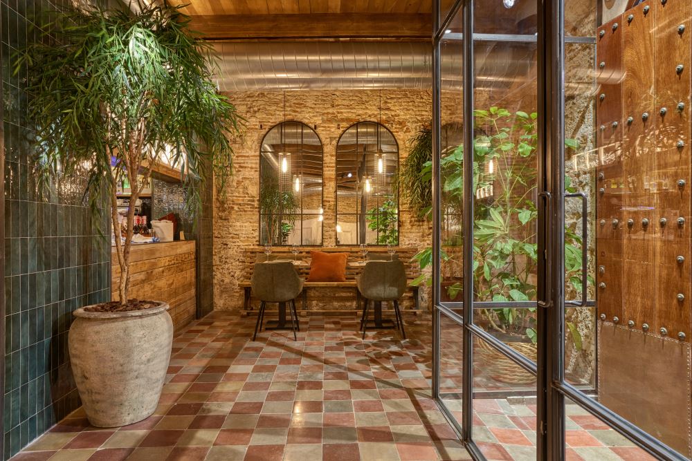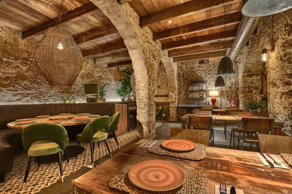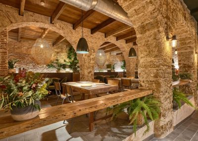 Nordic style lamps, upholstered chairs and teak wood tables or natural rattan armchairs complete the interior decoration making the place a cozy and warm space. The architecture of the premises with those old arches and the oyster stone of Cadiz, provide a unique setting.