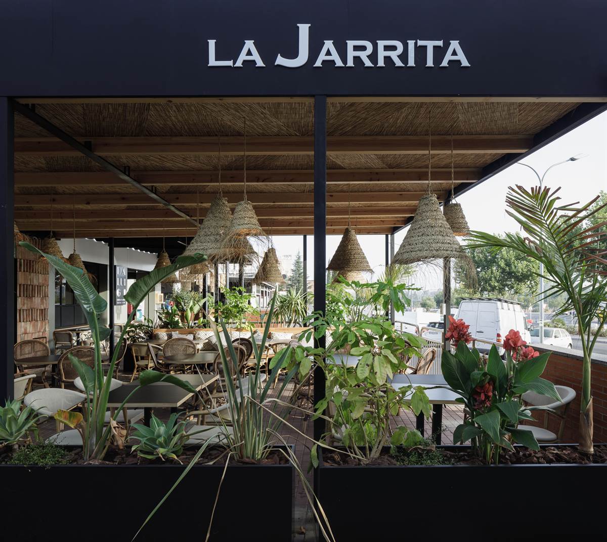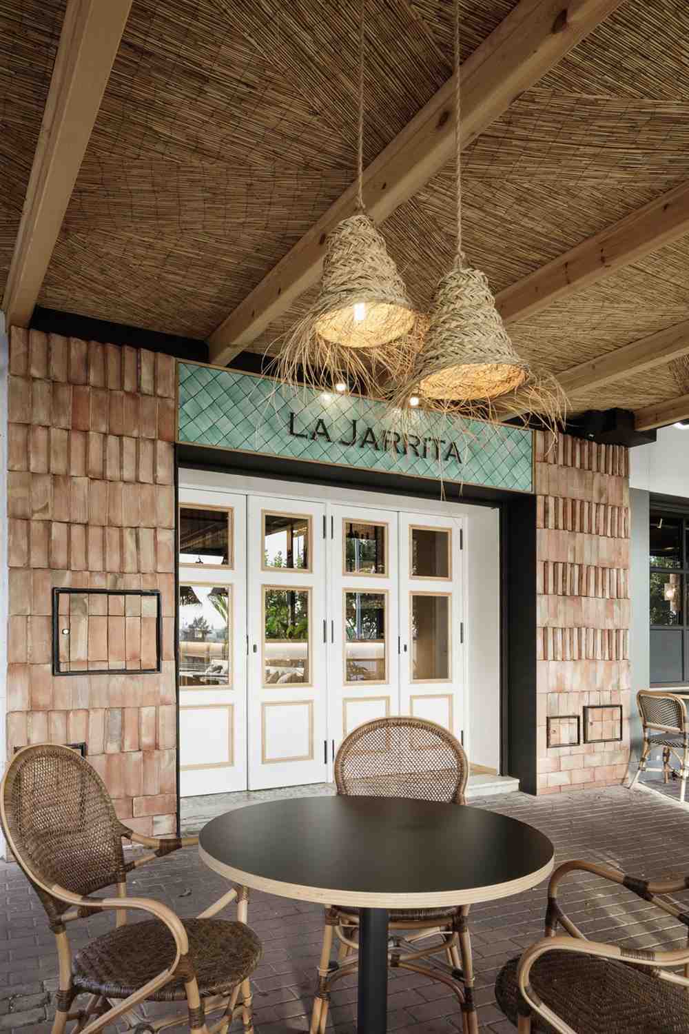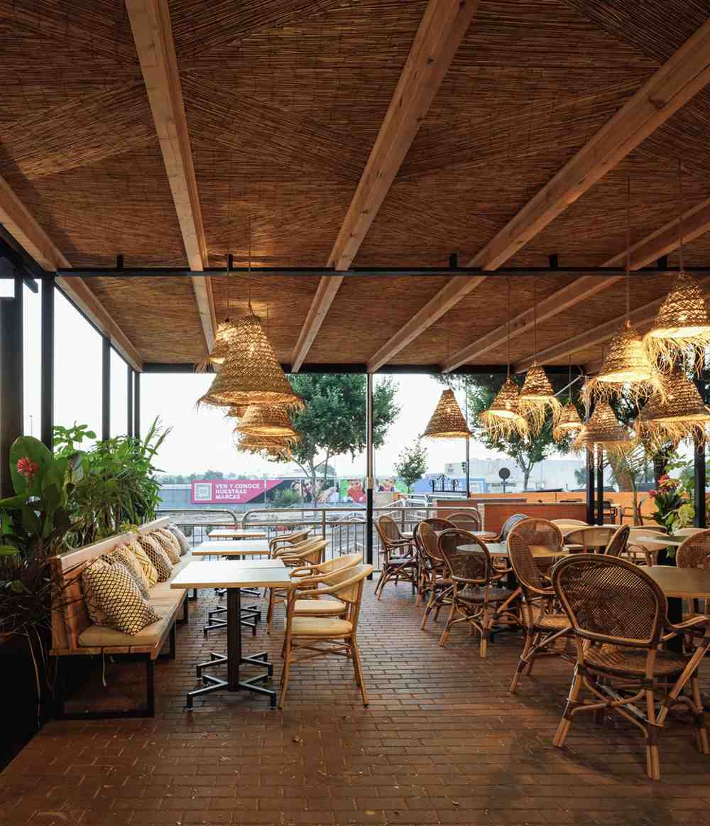 The terrace, the protagonist of the place, is decorated in Mediterranean style, where the fibers on the ceiling and lamps give it a very cozy and boho touch. The chairs, designed for outdoors, and stackable, are aesthetic and functional at the same time. A very large space where 3 areas are defined, one side with a wooden bench with upholstered cushions, designed for large gatherings. The central part, with round tables, more familiar, and the other side, where the tables and chairs are distributed in the form of a wagon, to have more privacy between tables.