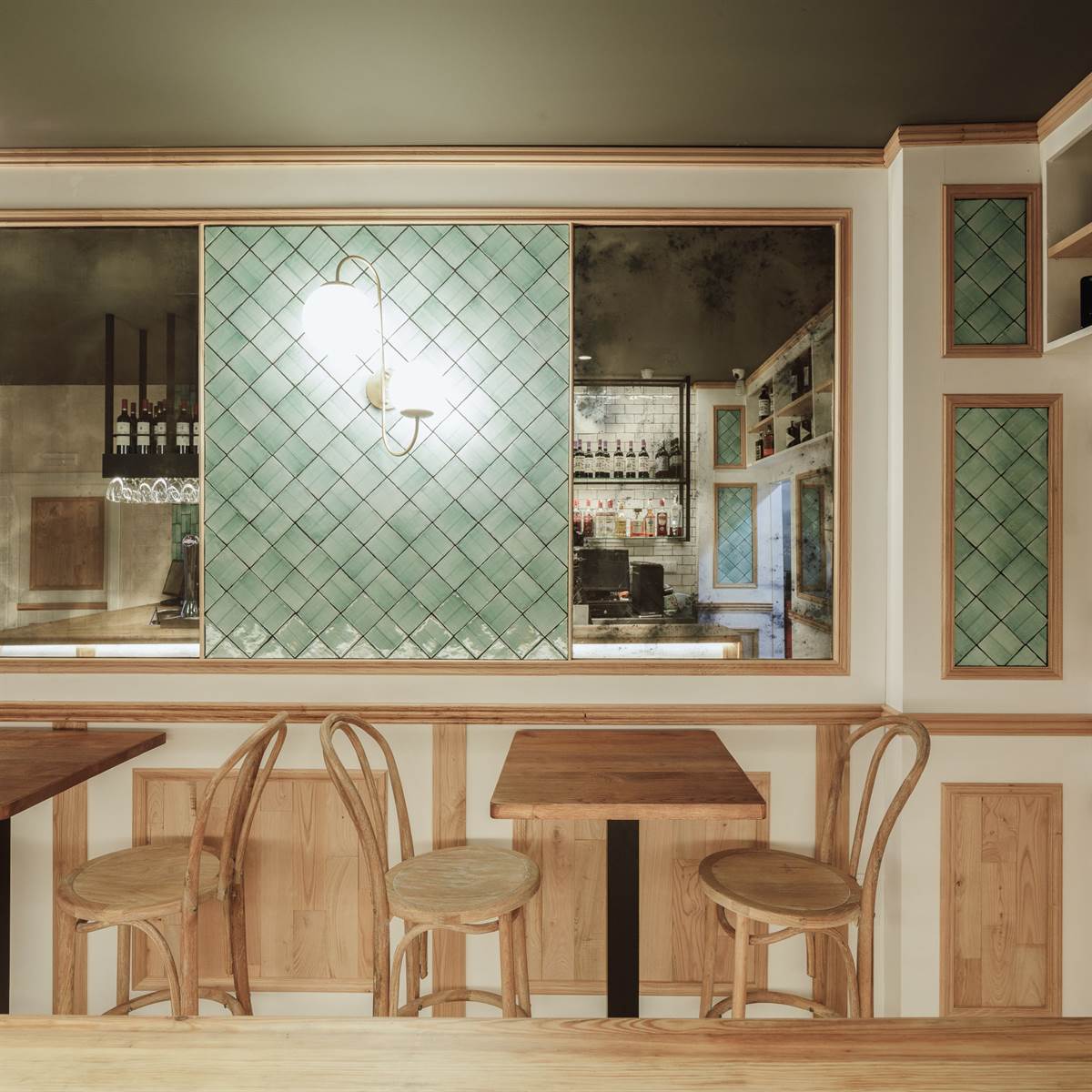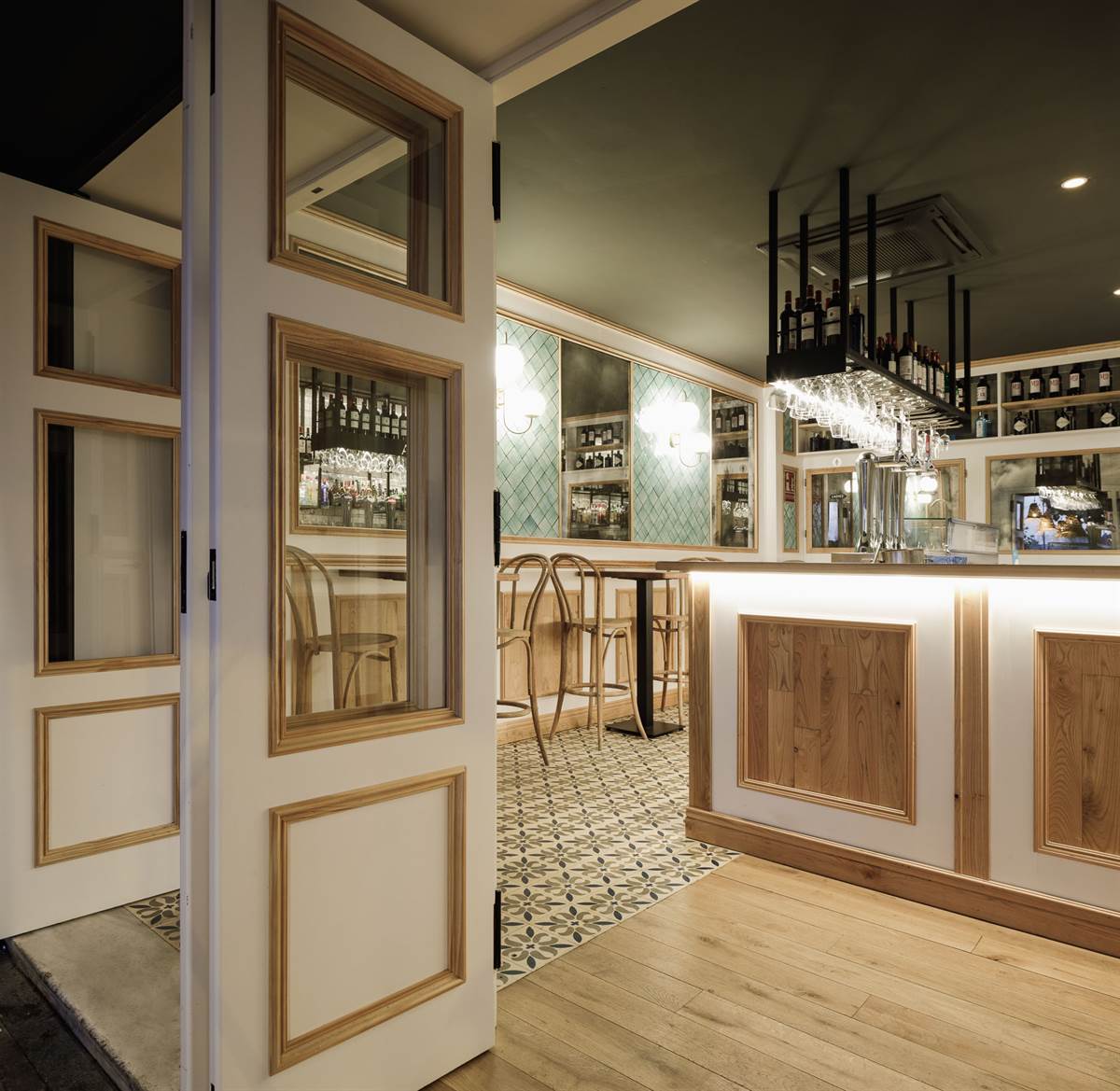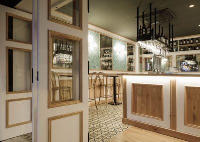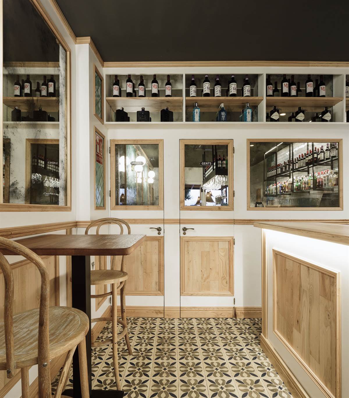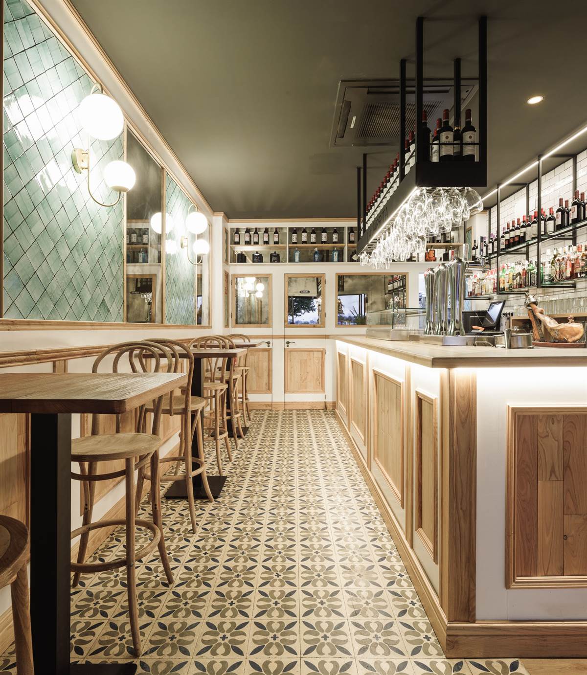 The interior, with touches of Mid Century and Rural style, has two areas, one with a bar and the other with high tables. Although the interior is small, the aesthetics are perfectly defined and a balance between materials, patterns, colors and textures, which is very enveloping and gives a personality of its own to this place.