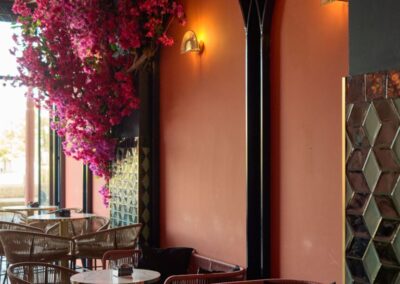 To achieve a well-rounded decoration, they chose our custom-made upholstered benches, colorful chairs, and Bistro-style tables, creating an ensemble that attracts many patrons not only for the live music but also for the beautiful ambiance they have created inside. From the afternoon until closing, live music and flamenco will take center stage with various performances and shows happening on the stage.