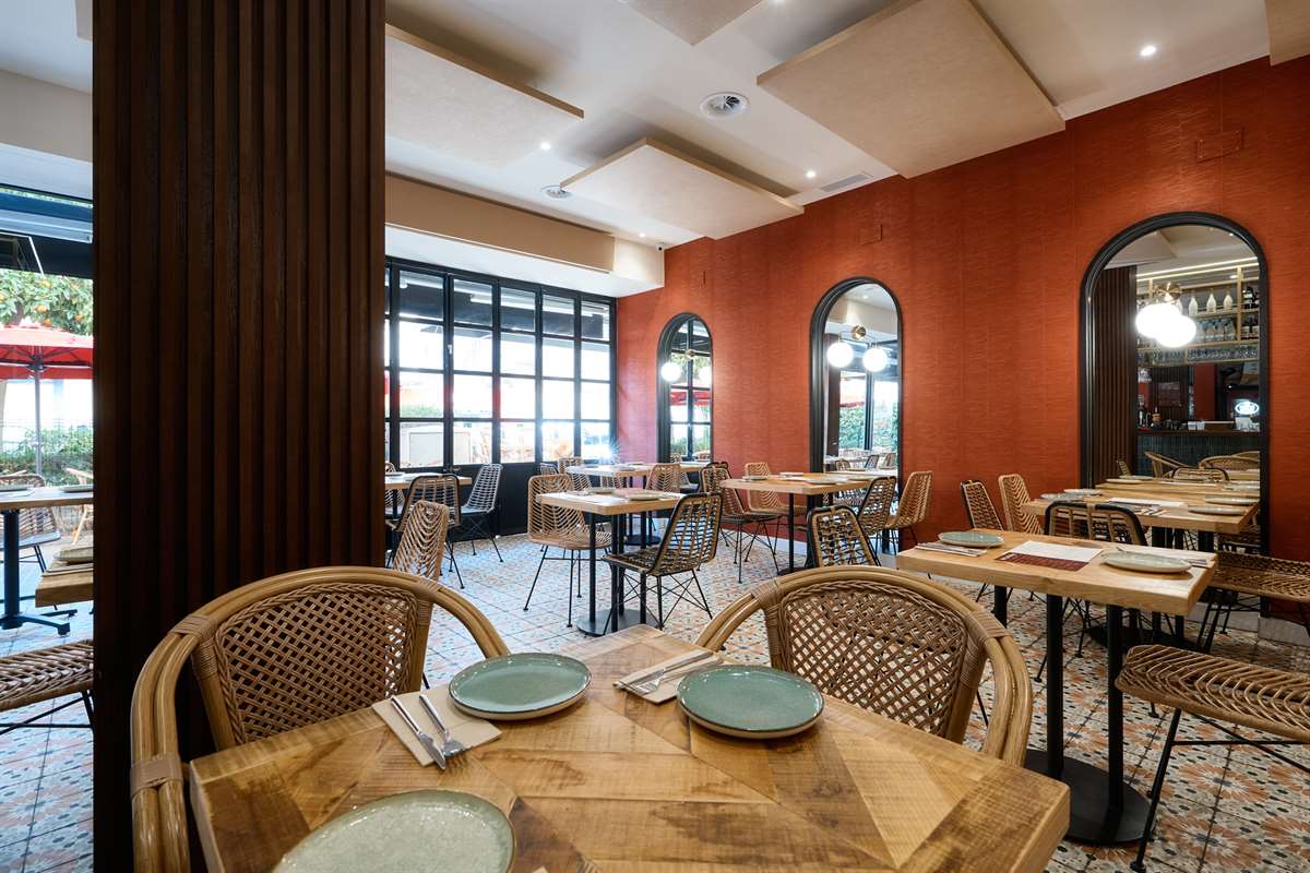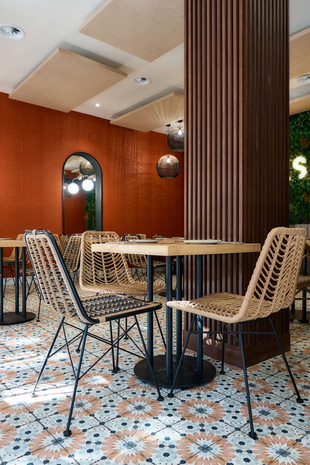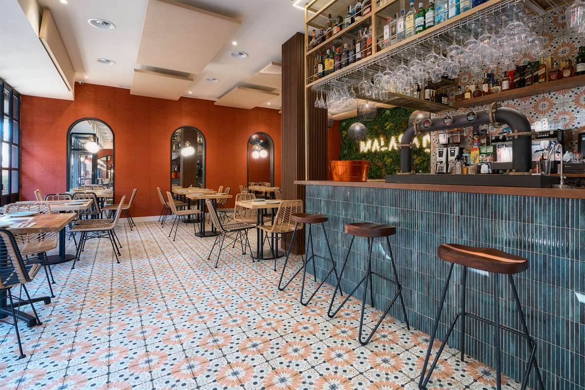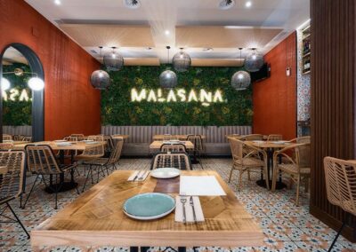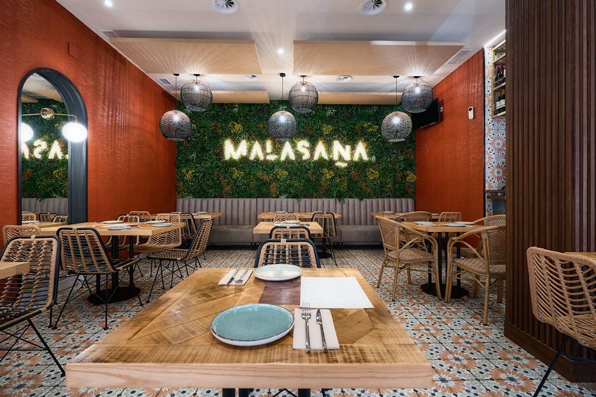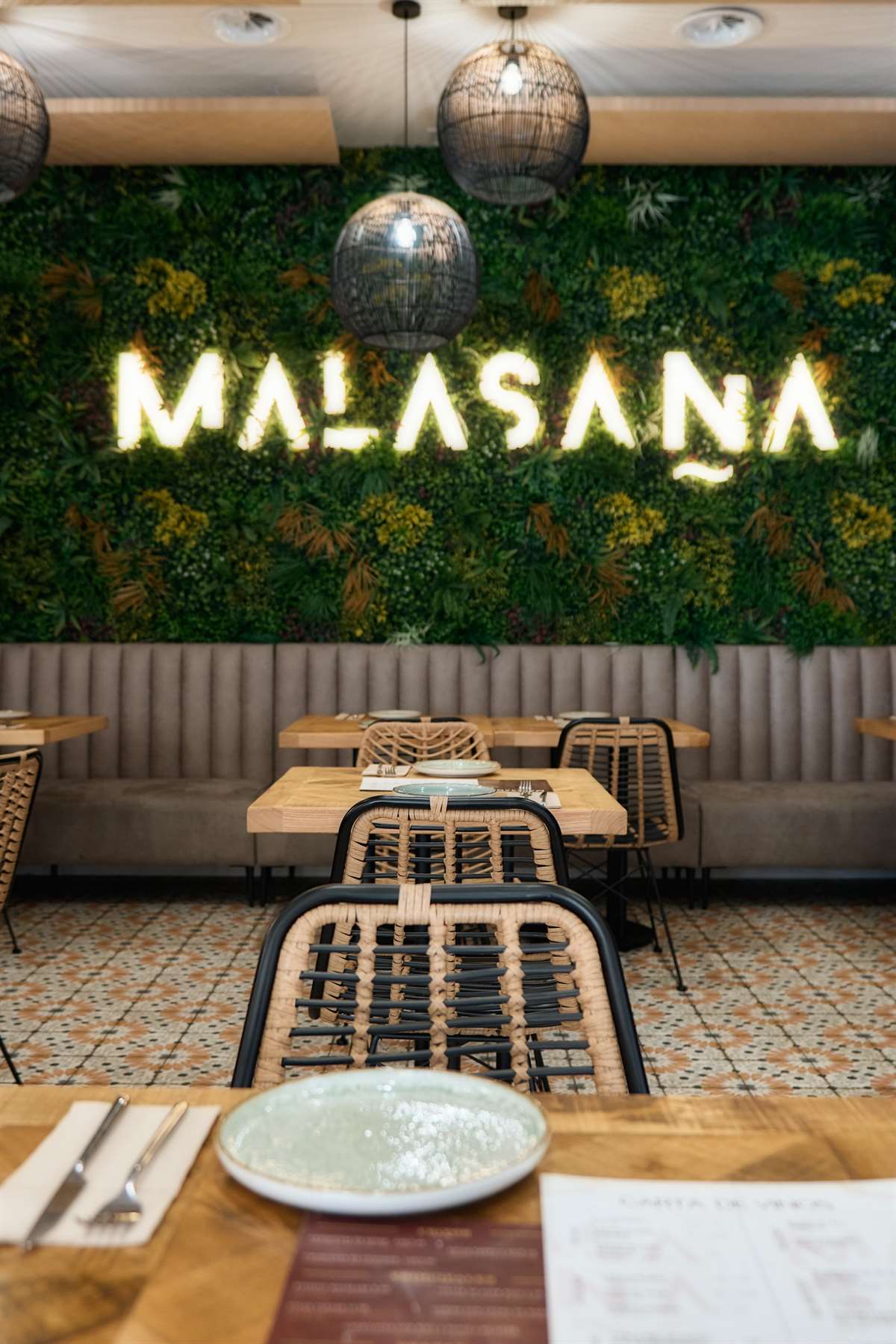 After a thorough renovation, Malasaña is transformed into a cozy atmosphere that integrates into the neighborhood with large folding windows that connect the terrace with the interior. The terracotta-toned walls are adorned with large mirrors, while the columns feature wood paneling and the floors are tiled with hydraulic tiles. In the background, above an area of upholstered benches, there is a vertical garden framed by a luminous light with the name of the establishment.