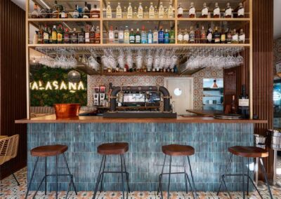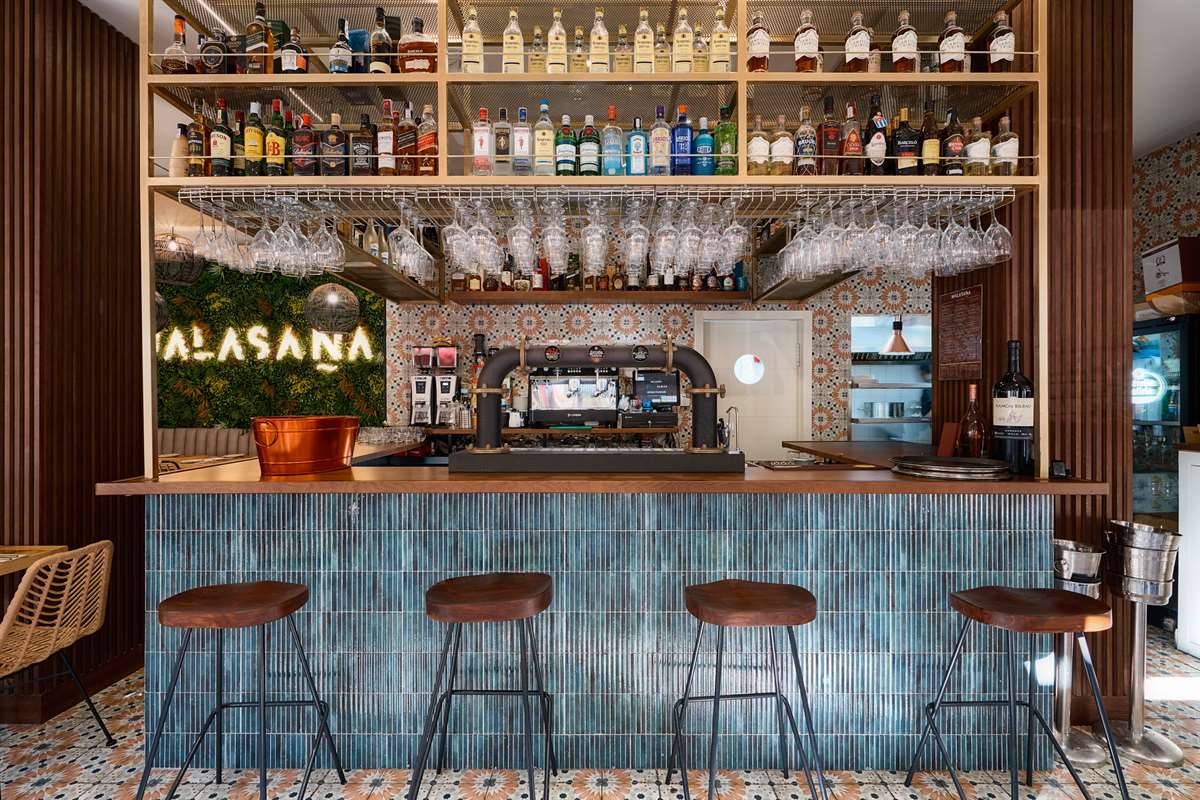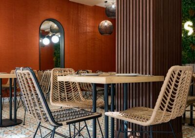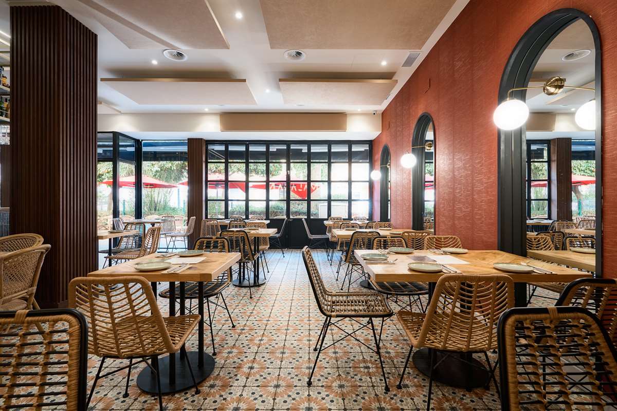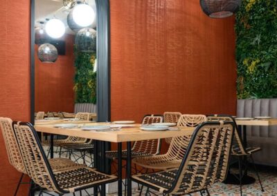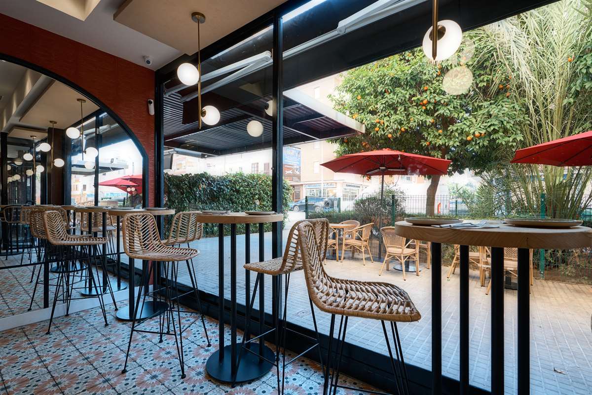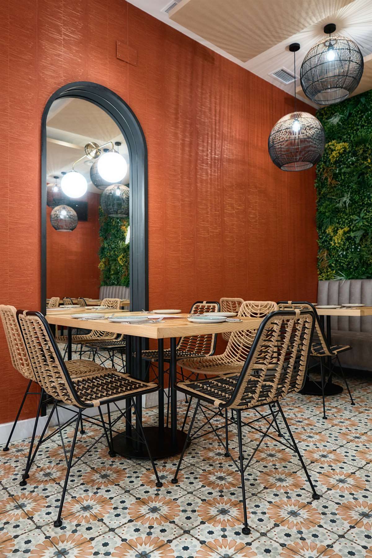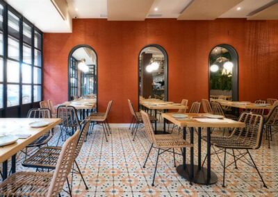 After a thorough renovation, Malasaña is transformed into a cozy atmosphere that integrates into the neighborhood with large folding windows that connect the terrace with the interior. The terracotta-toned walls are adorned with large mirrors, while the columns feature wood paneling and the floors are tiled with hydraulic tiles. In the background, above an area of upholstered benches, there is a vertical garden framed by a luminous light with the name of the establishment.