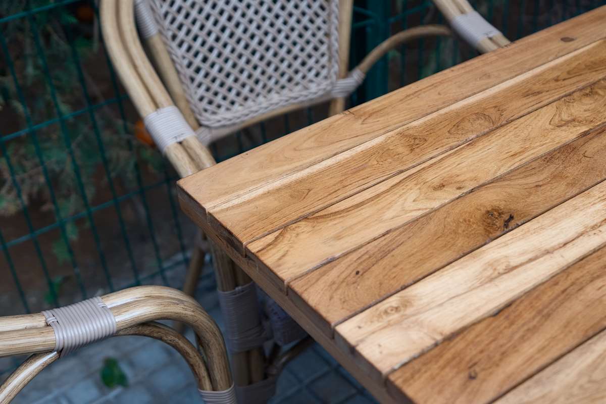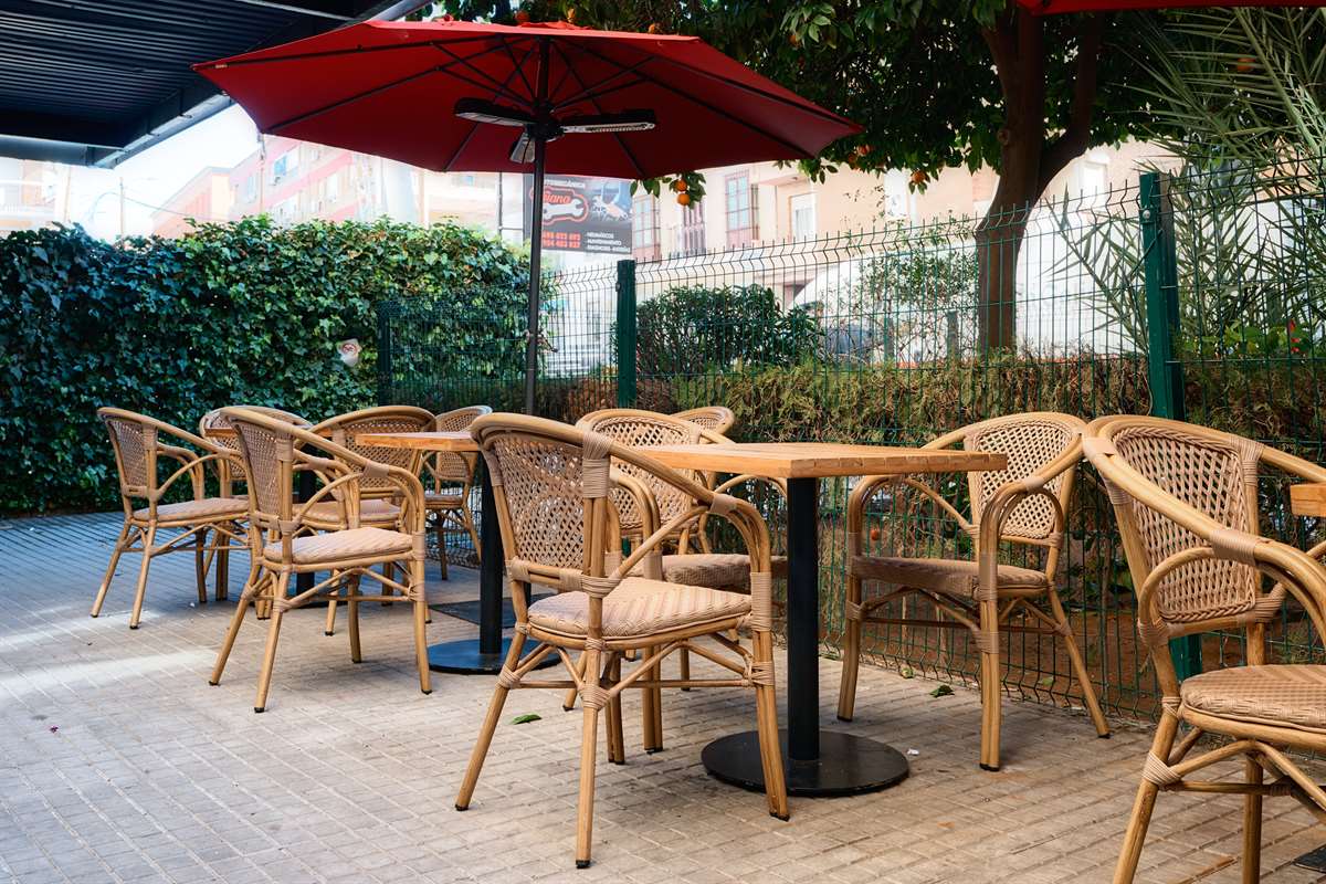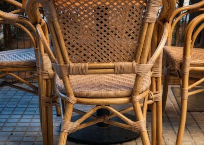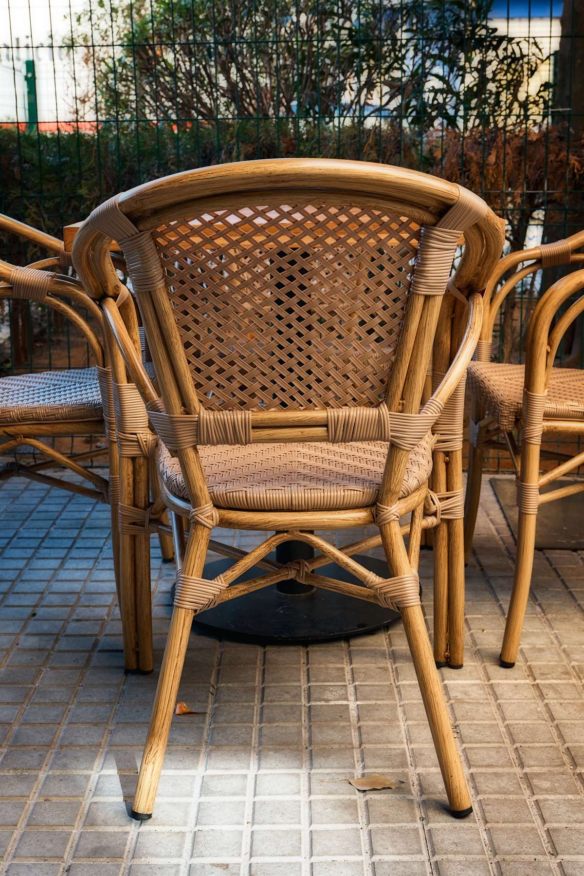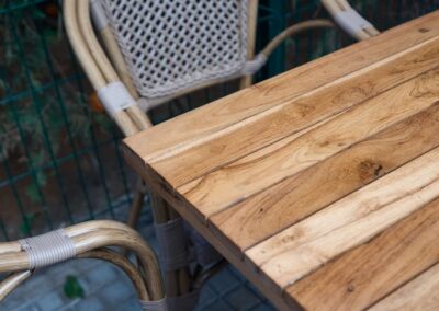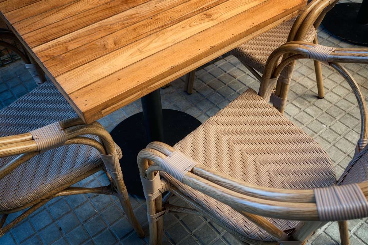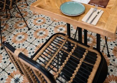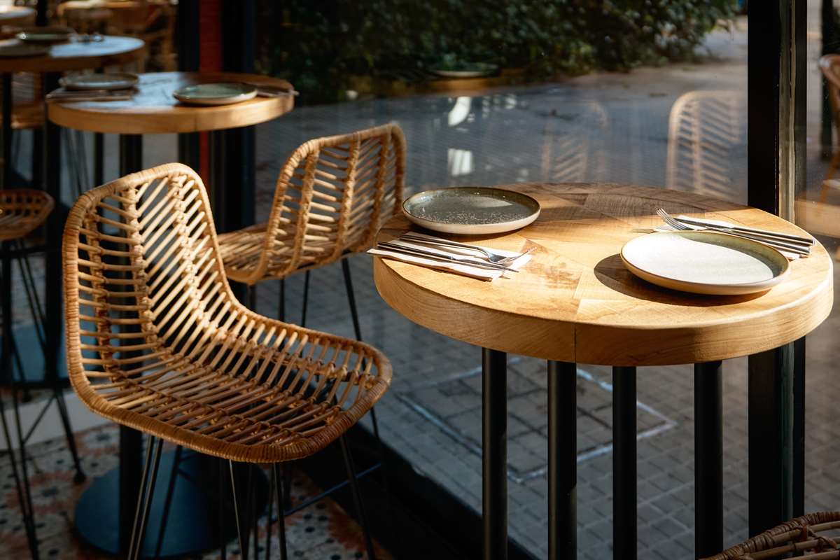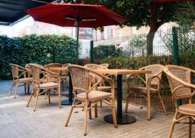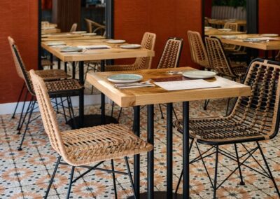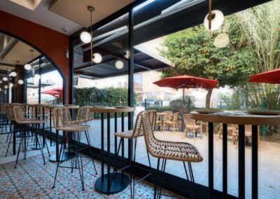 In the interior room we find again the set formed by rattan chairs and wooden tables with metal frames, which together with the decoration, provide the characteristic stamp of a modern bistro.