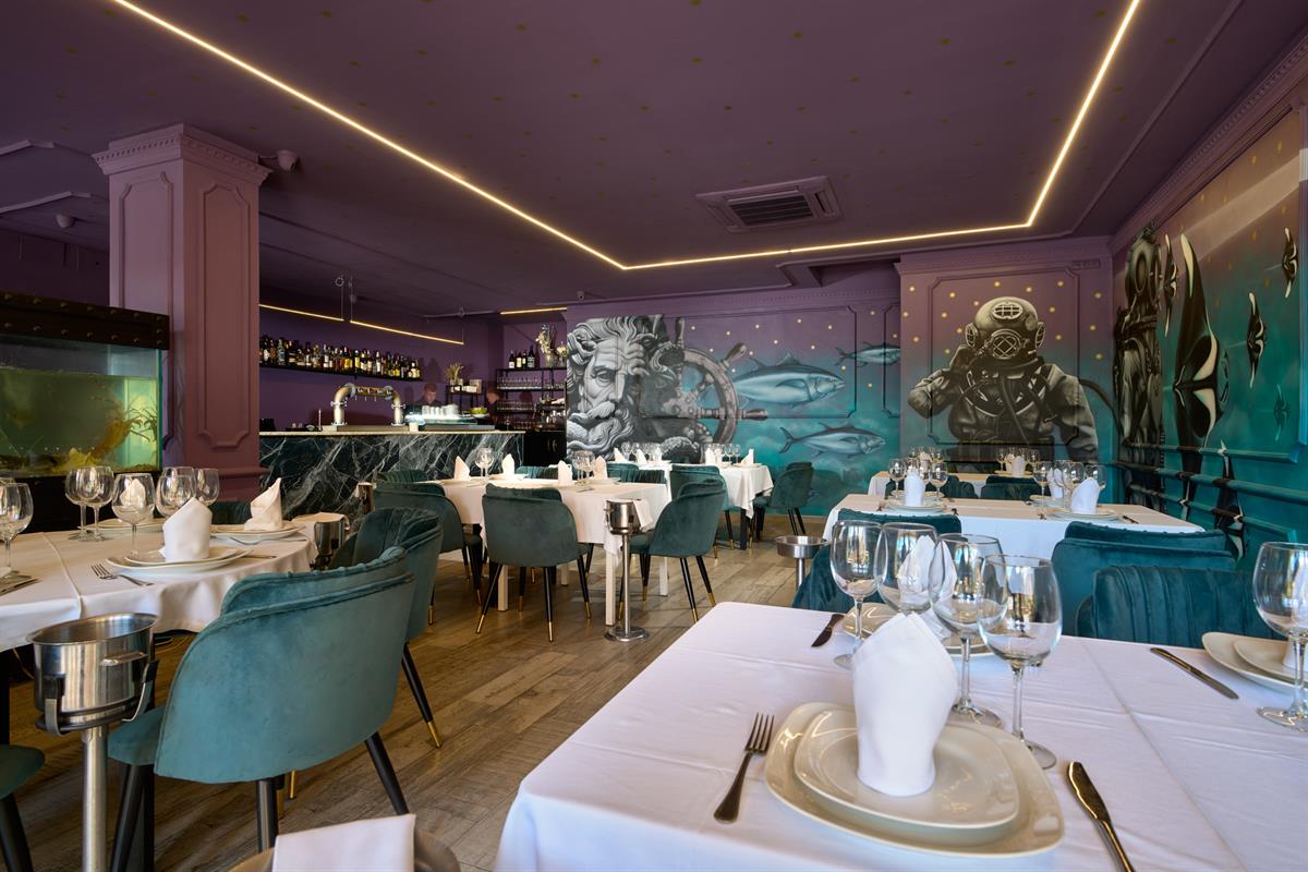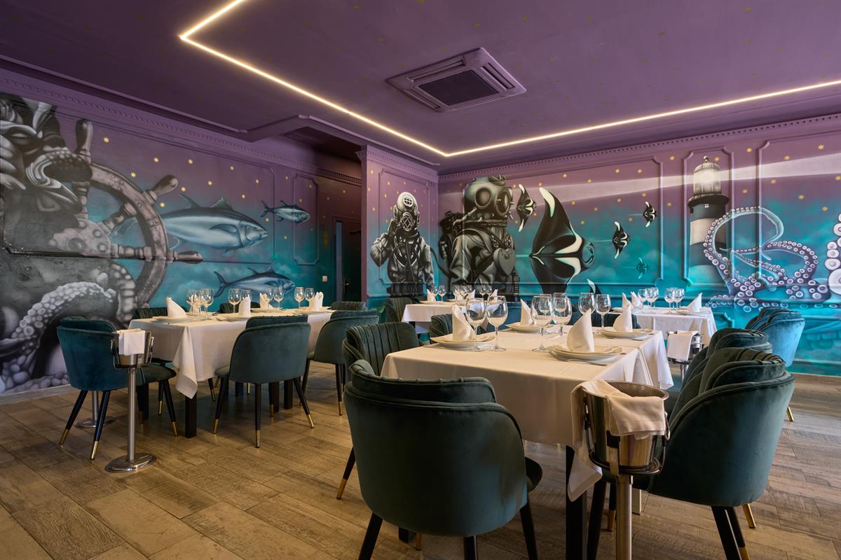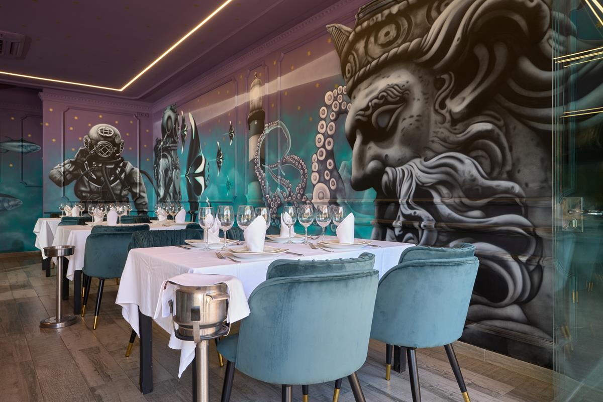 After a reform, where the work of the muralist Marcos Muñoz shines, reopens its doors, as always with its specialty in seafood. Marcos Muñoz, once again impresses with a very elaborate mural with a marine theme, in water green and purple colors, and the different protagonists in shades of gray.