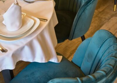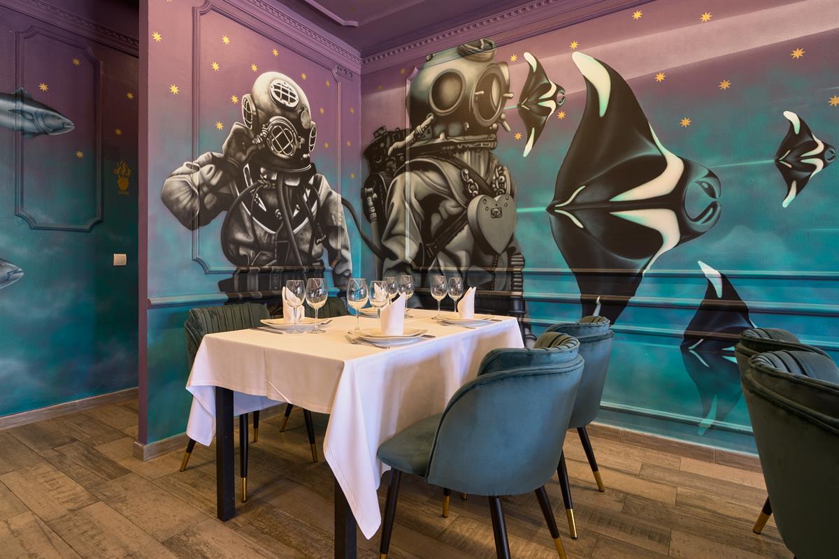 The decoration is rounded off with chairs upholstered in tones that match the background of the mural, creating an enveloping atmosphere for the diner, who will enjoy the menu of this wonderful restaurant as if he were part of Marcos Muñoz’s work.