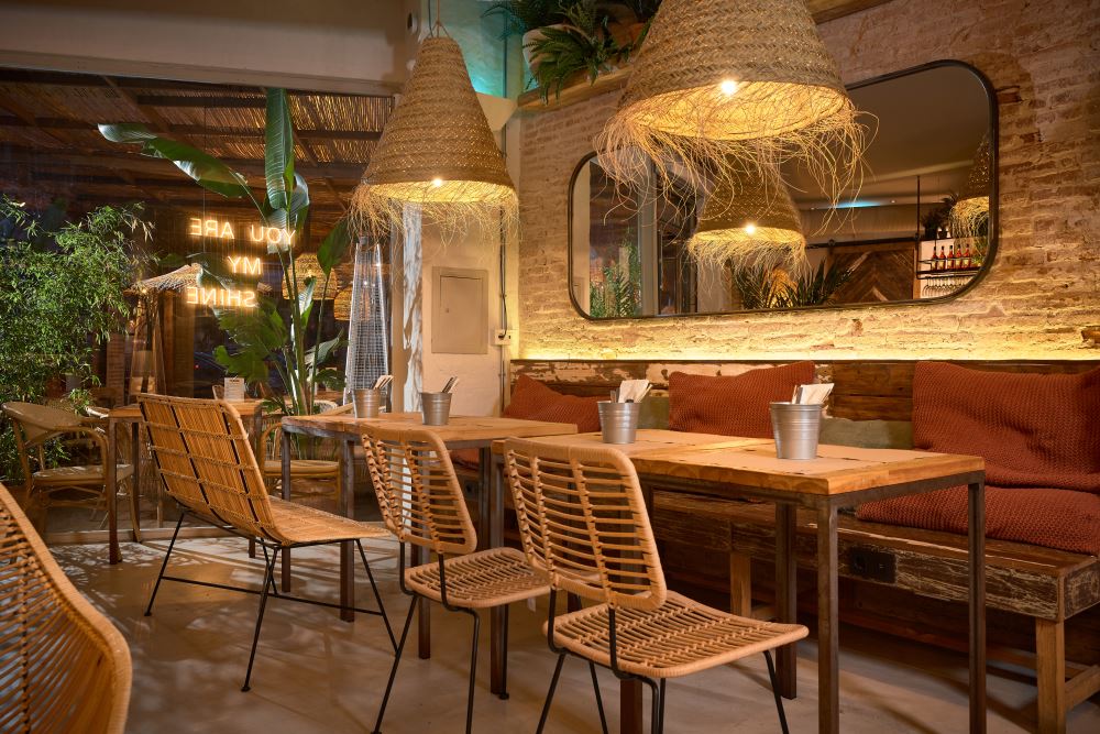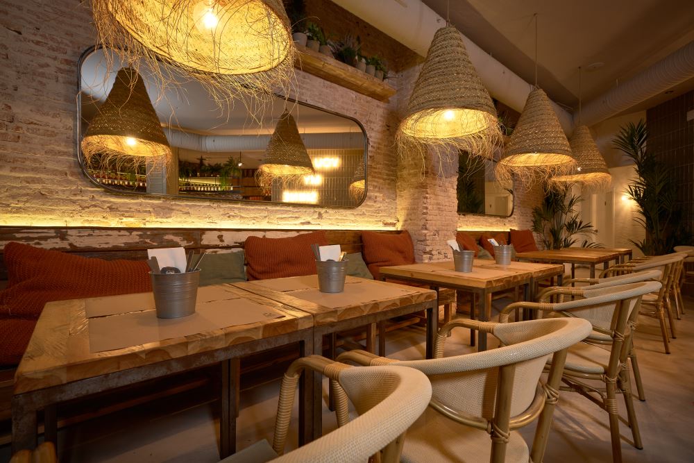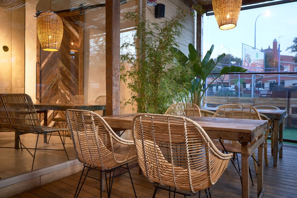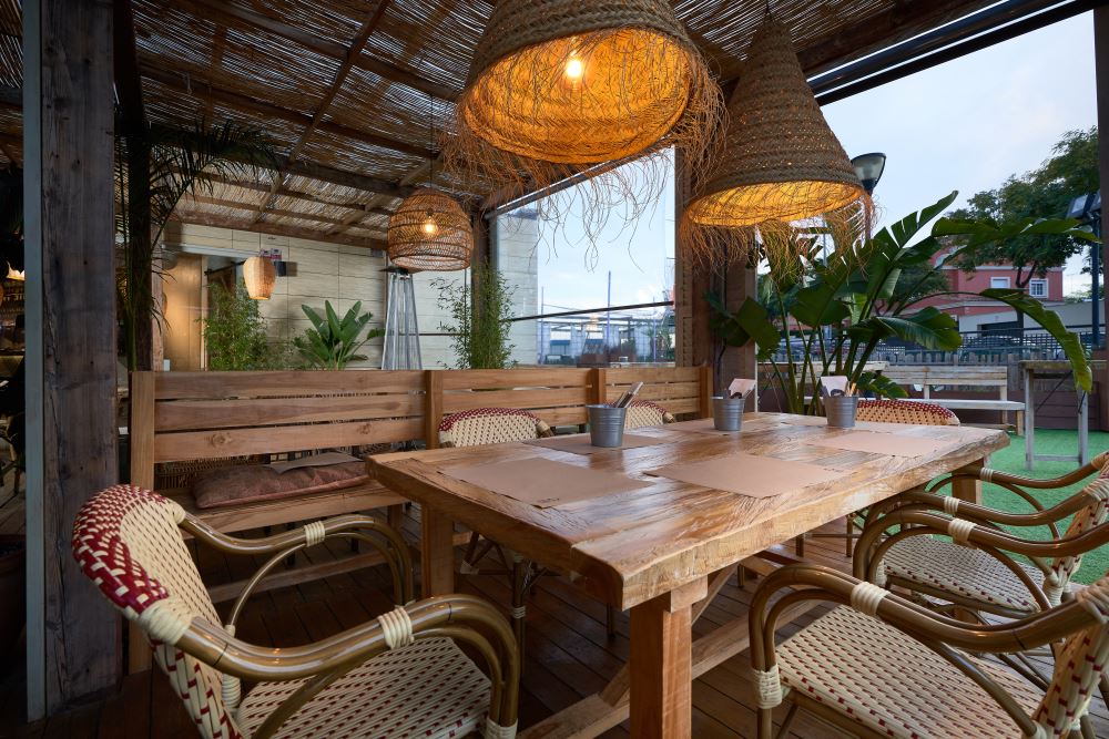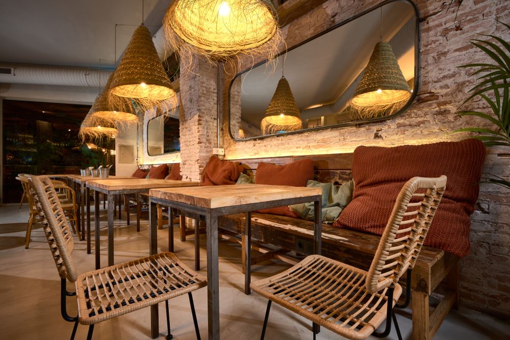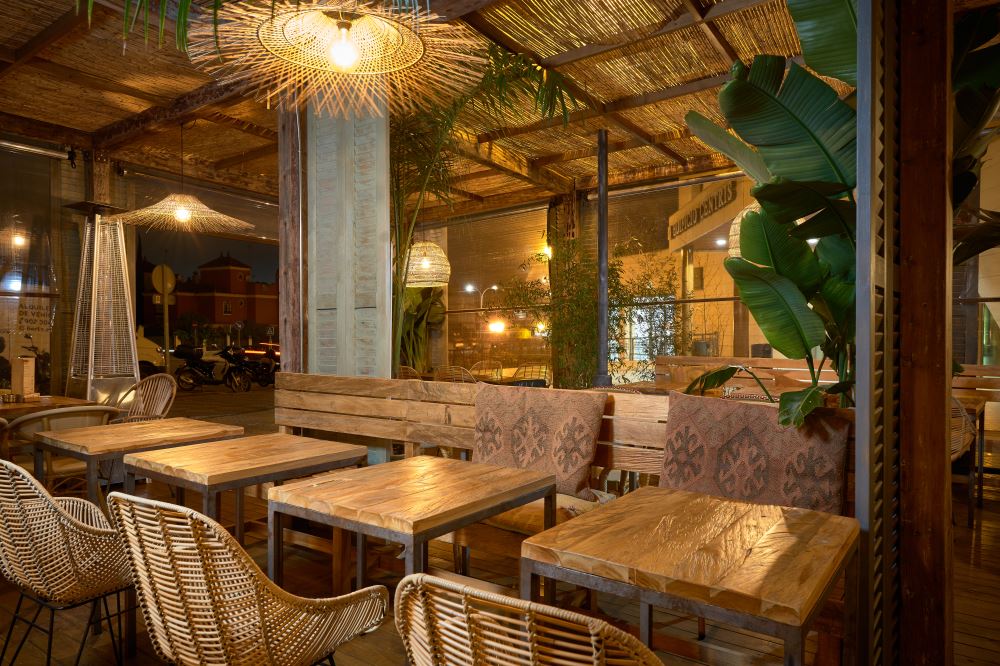 On the outskirts of the Andalusian capital, in the town of Tomares, interior designers Bruno Bermúdez and Adrián Gómez have brought the chiringuito concept to the city, where they have created a wooden terrace and reeds in the purest beach style. Predominating warm colors, wicker lamps, esparto grass blinds, wooden furniture and rattan chairs, they manage to create a space both inside and outside as if we were tasting a hamburger or noodles on the beach.