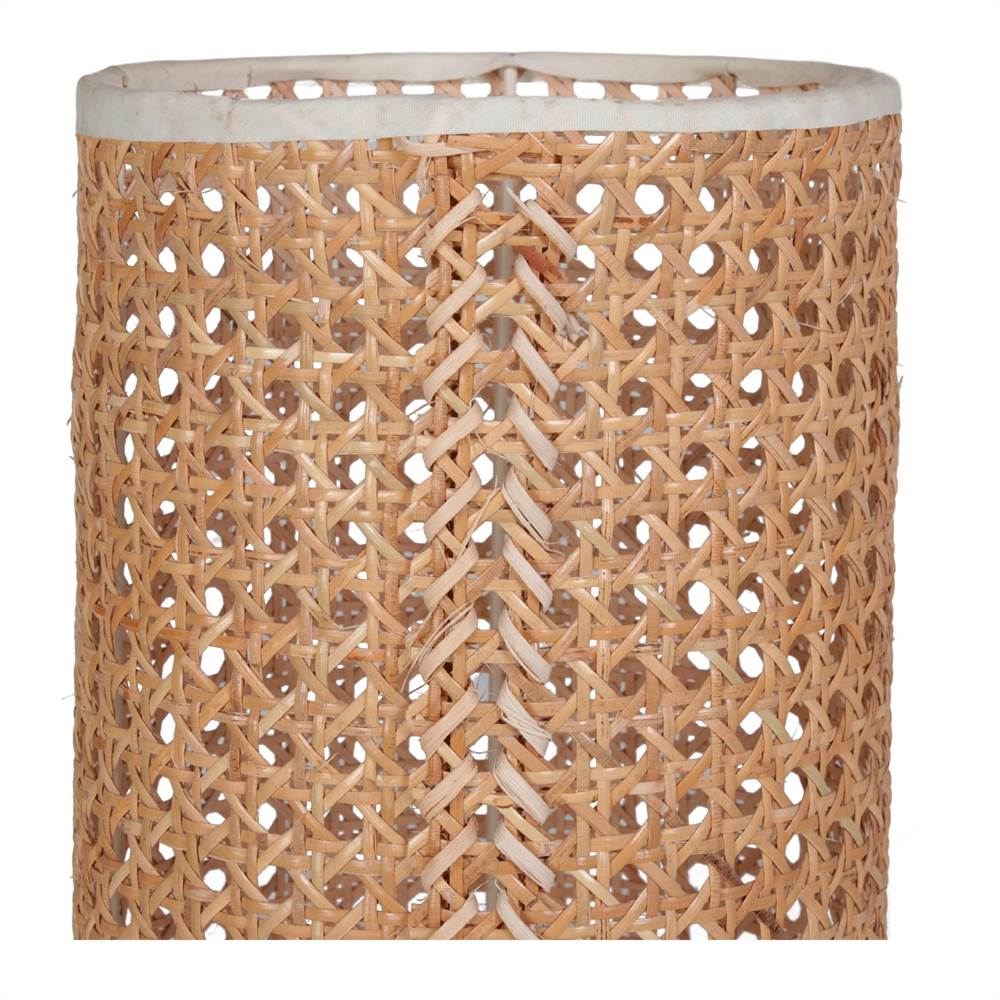 Table lamp with lampshade made of natural rattan grid.