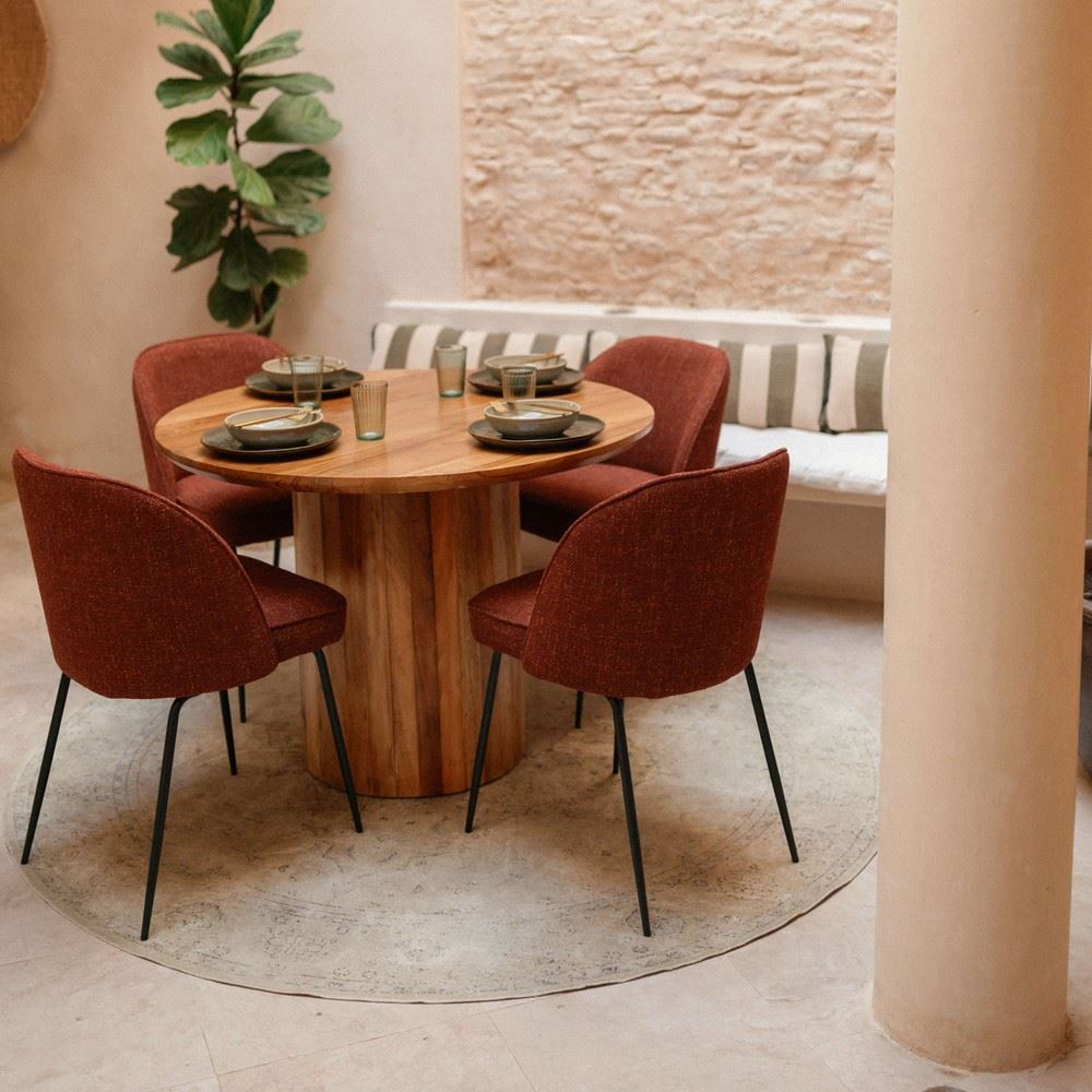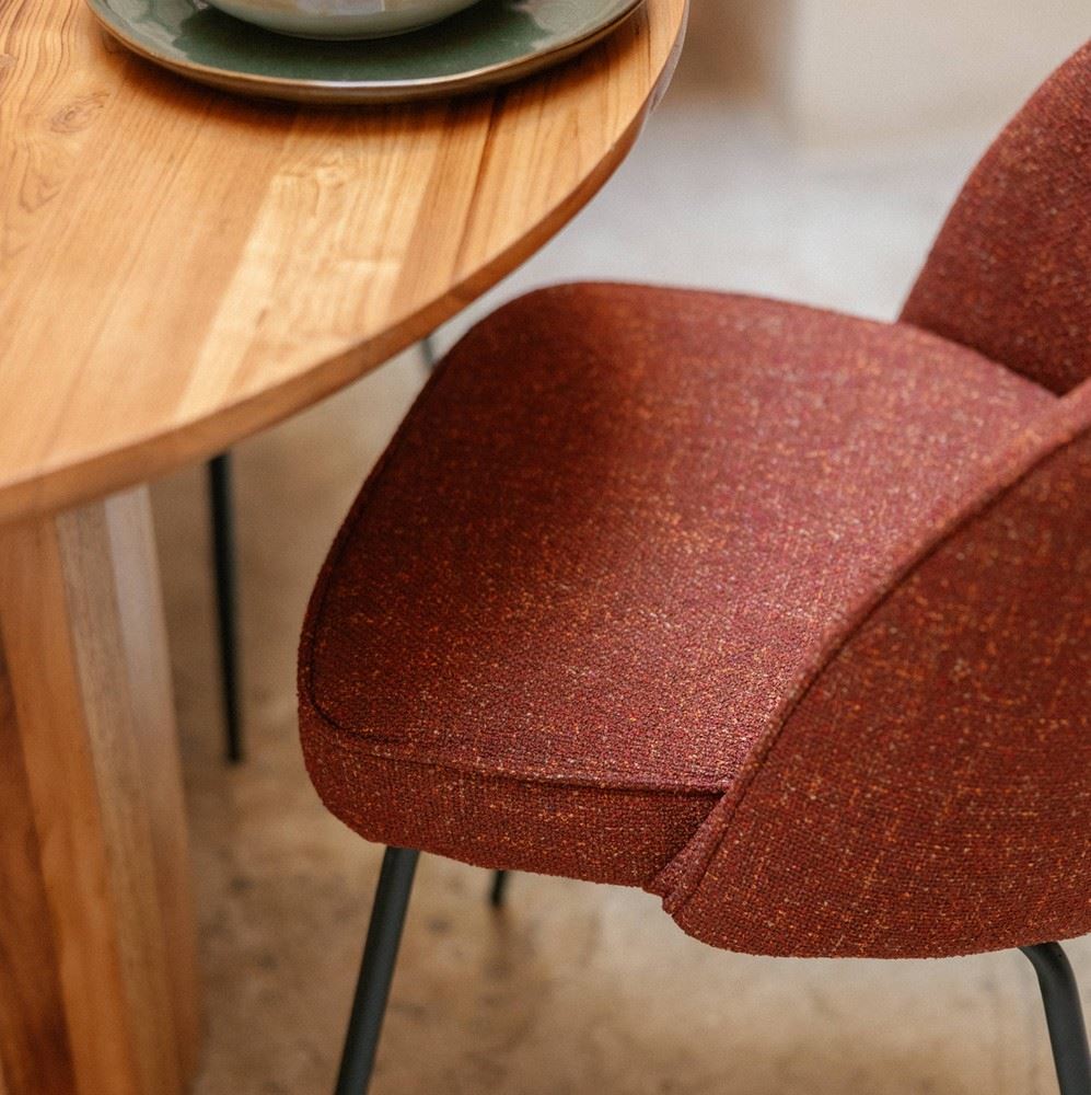Originality and comfort are at the heart of the Seken upholstered chair ‘s design. Its fabric upholstery will provide a soft touch and a comfortable seat as well as a warm and welcoming look to your indoor space. Cushioned in foam, this upholstered chair is ultra comfy, which makes it a perfect dining room chair. To make this upholstered chair shine we can combine it with a big dining table.