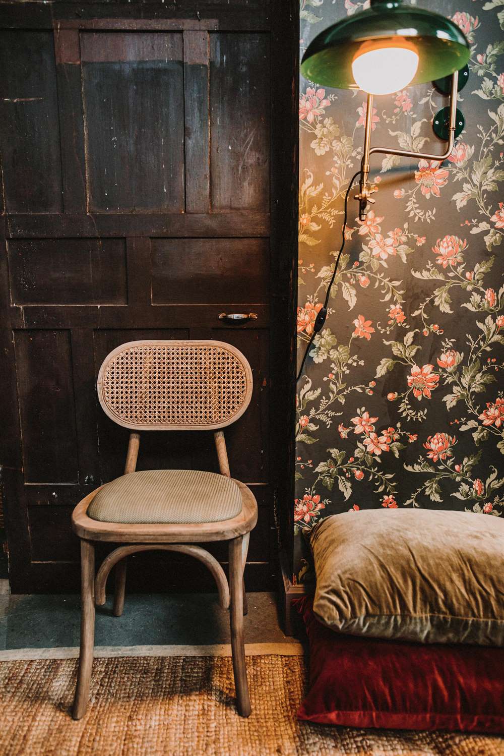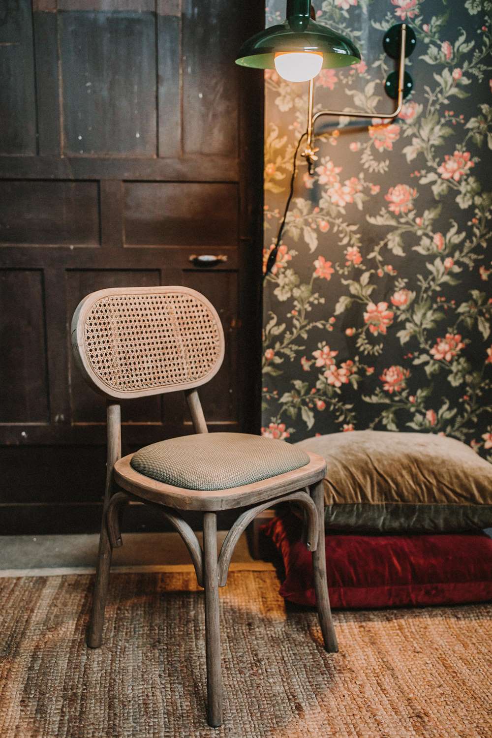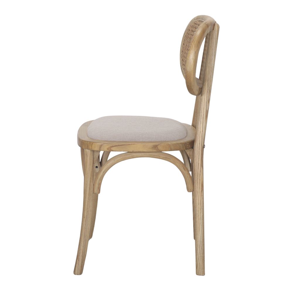 Seat upholstered in textile and backrest in cannage type natural fiber mesh.