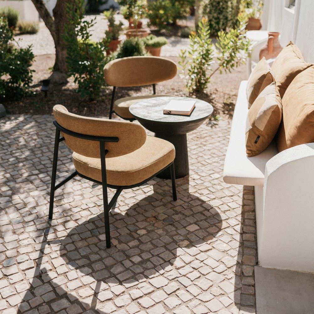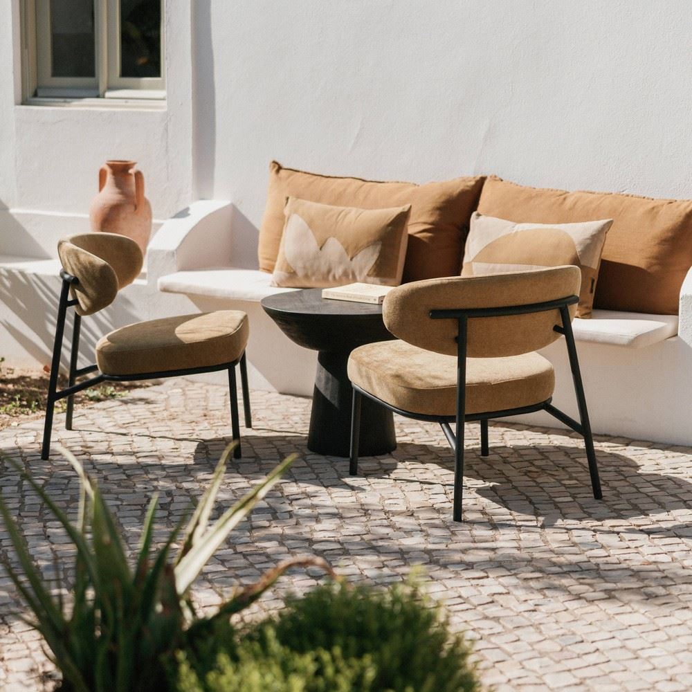The textile upholstery adds a sense of comfort and warmth, inviting you to relax and enjoy moments of rest or conversation in its cozy embrace. Its versatility makes it ideal for living rooms, reading areas or even bedrooms, adding a touch of style and personality to any setting.