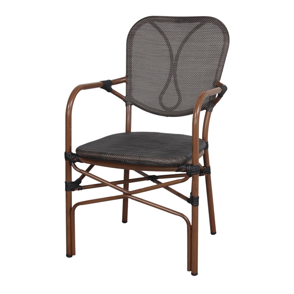 Outdoor stackable chair Bistro style with armrests.