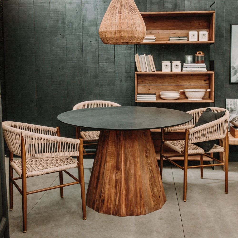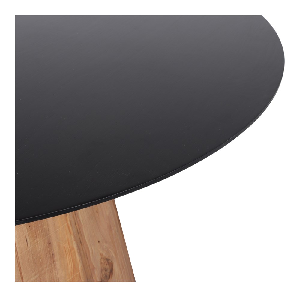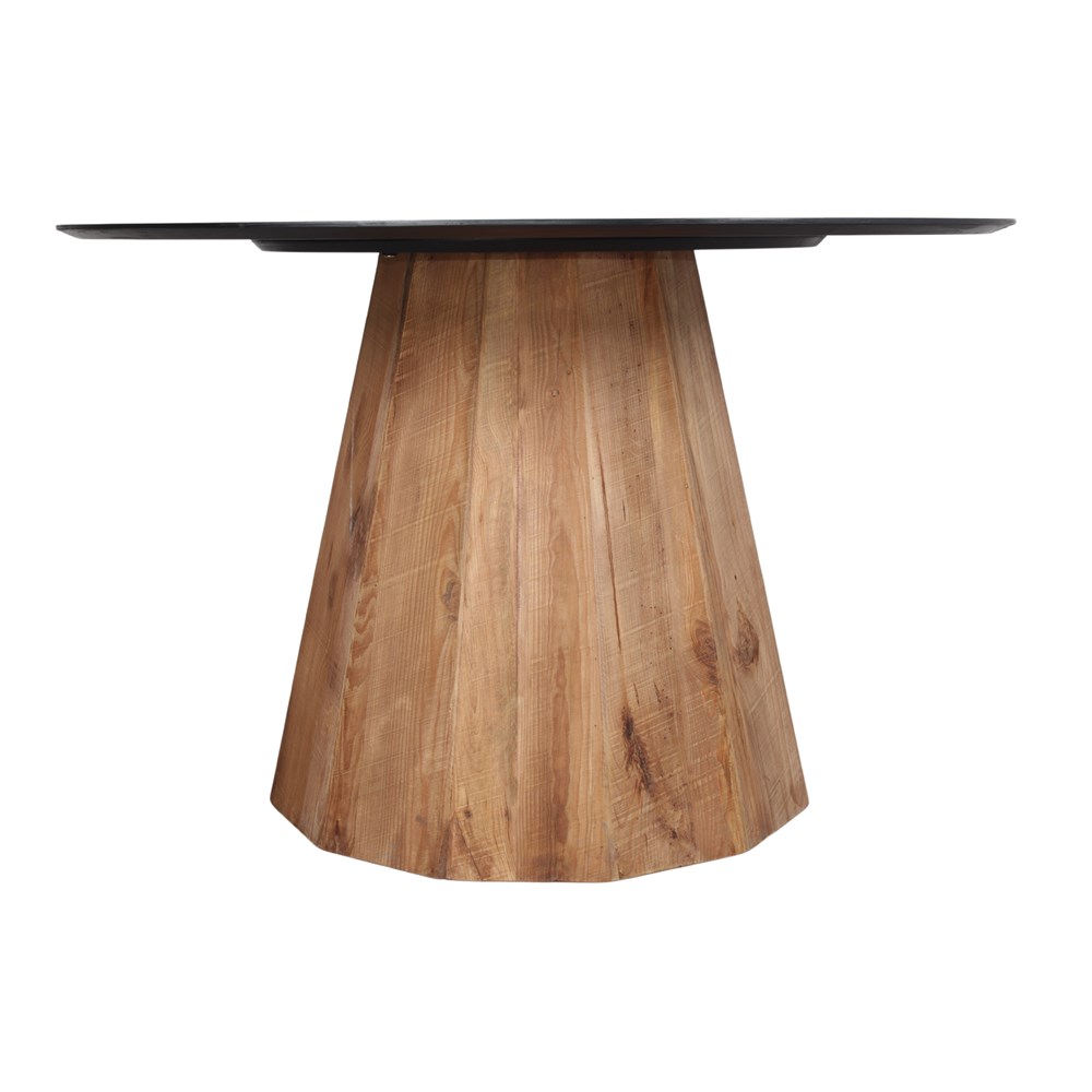 The Steffy wooden table follows the Nordic style. This round table has a recycled pinewood frame, and a plywood beveled tabletop with black powder paint finishing.