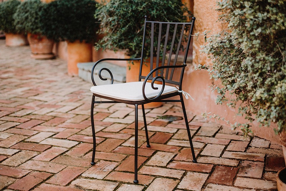 Steel, on the other hand, is the most resistant and hardest of the metals used to manufacture outdoor chairs. It is composed of an alloy of iron and small percentages of other metals, which guarantee its resistance and durability against all types of atmospheric phenomena, as well as against scratches, corrosion and shocks. This hardness is enhanced when it has a powder finish. Maintenance of steel outdoor chairs? Very easy: simply wipe with a damp cloth. Lastly, iron is a material that is not recommended when choosing outdoor chairs: humidity and rain deteriorate it, causing the paint to peel off and rust. They also splinter quite easily. That doesn’t mean, however, that we can’t still enjoy the beauty of charismatic wrought iron outdoor chairs. These coquettish vintage outdoor chairs, with French echoes, which were once heavy and difficult to maintain, are now made of steel. A wonderful example of this development is the Paony outdoor chair, a tubular steel frame with a rust powder-coated finish. It also has a polyester cushion with anti-rain treatment, making it completely weatherproof. Due to its light weight, it is also easily stackable.
