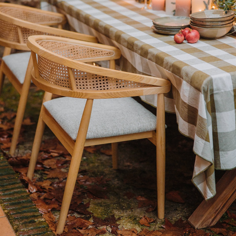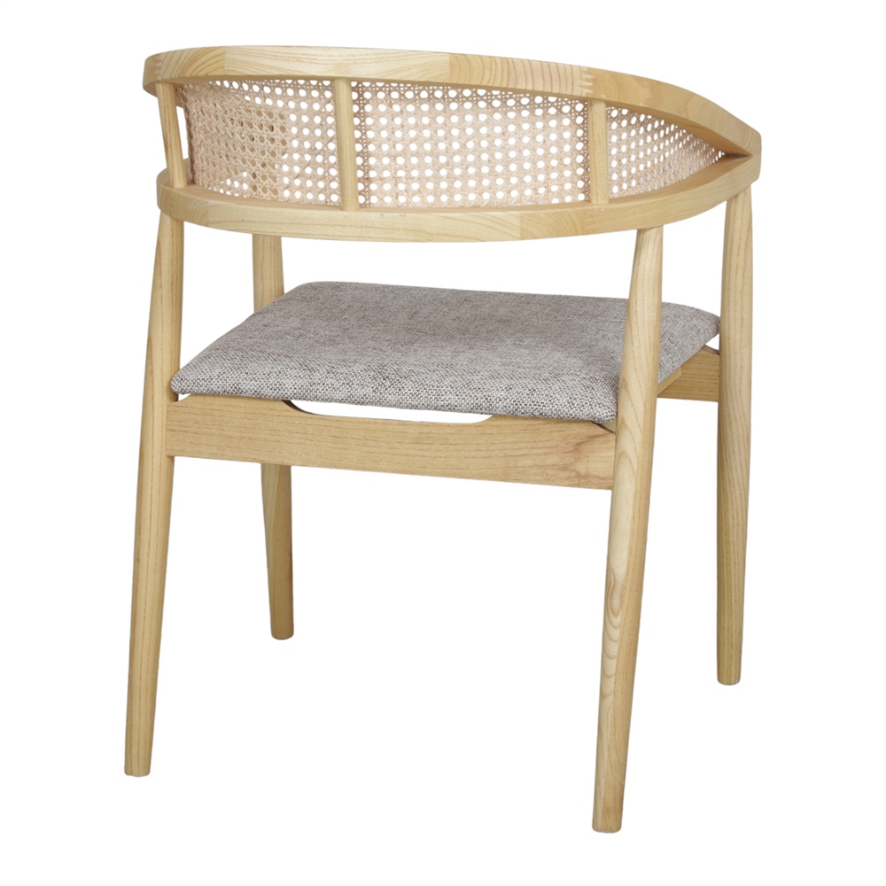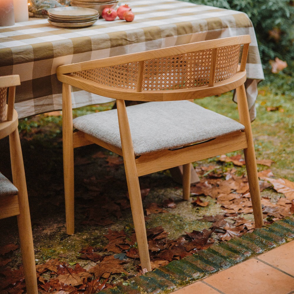 The Tiana wooden chair is made of elm wood, the backrest in cannage style woven in bulrush fiber and the seat upholstered in textile. With steam bent, with beautiful armrests, this chair with a peculiar design, is of Japandi style. If you want to get this style where Japanese and Scandinavian style are mixed, this is your chair.