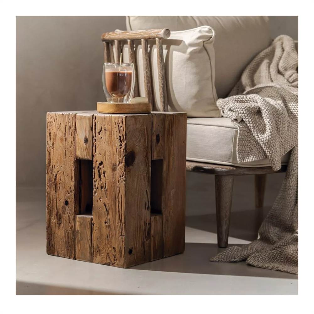 The Tresa side table is a rustic style piece that brings authenticity and warmth to any corner of the home. Handcrafted from recycled solid pine wood, it retains the unique character of reclaimed materials, showing irregular grains, marks of use and slight imperfections that tell their own story. This visual richness makes it a decorative element with soul, ideal for natural, bohemian or country environments.