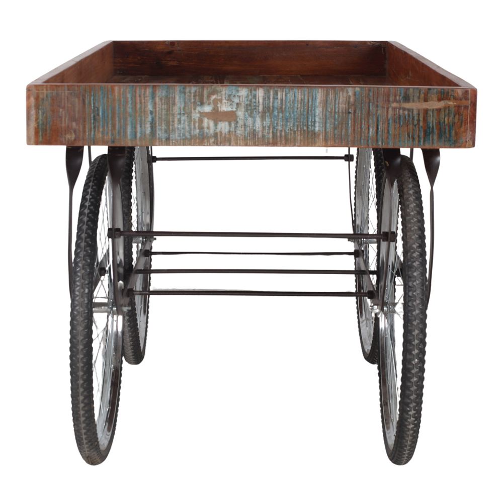 Its sturdy metal structure provides a solid base, while the bicycle wheels add a touch of originality and facilitate its mobility in different environments. These wheels, with their classic design, not only ensure a smooth ride, but also enhance the vintage character of the Velocar.