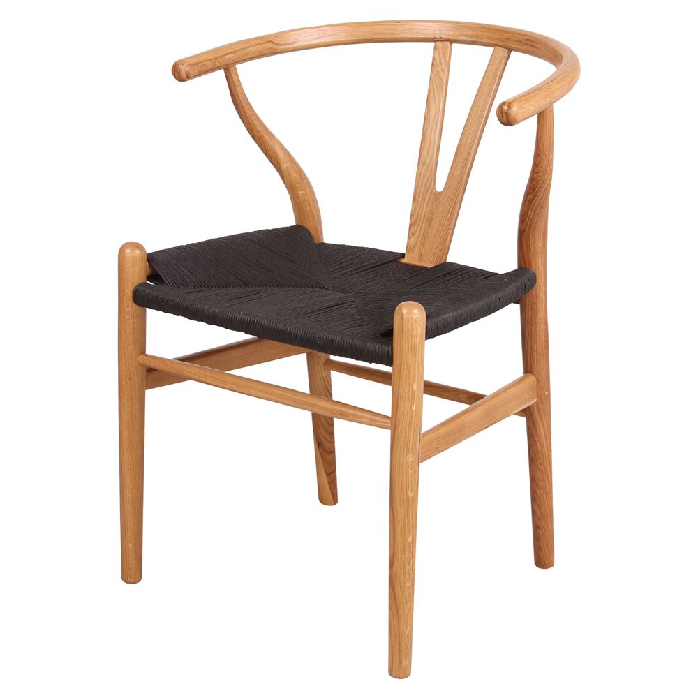 The Wegner wooden chair follows the Nordic style. It has an oak wood frame and a black-dyed, braided natural fiber seat.